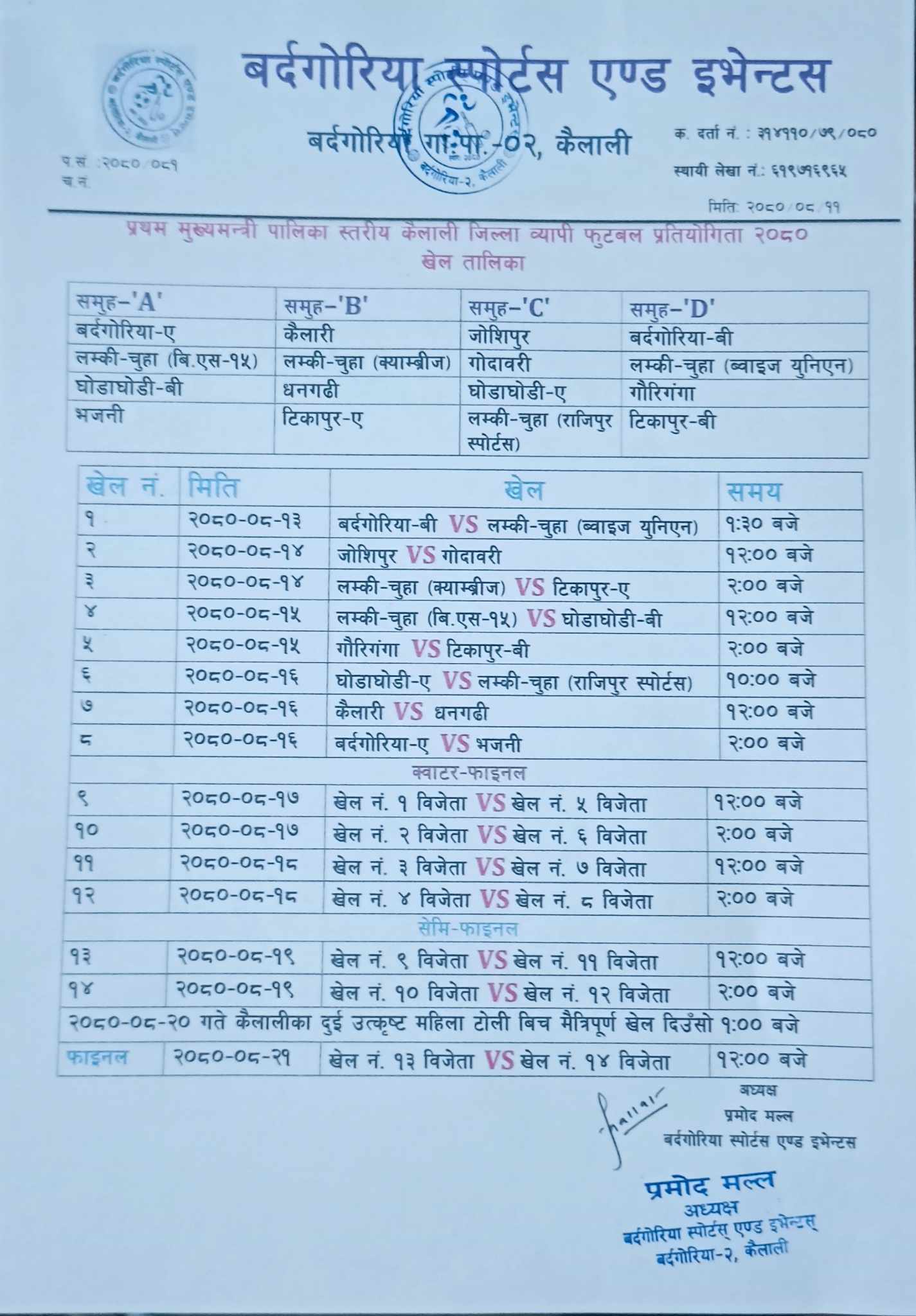 कैलाली । प्रथम मुख्यमन्त्री पालिका स्तरीय जिल्ला ब्यापी फुटबल प्रतियोगिता २०८० को खेल तालिका सार्बजनिक गरिएको गरिएको छ ।