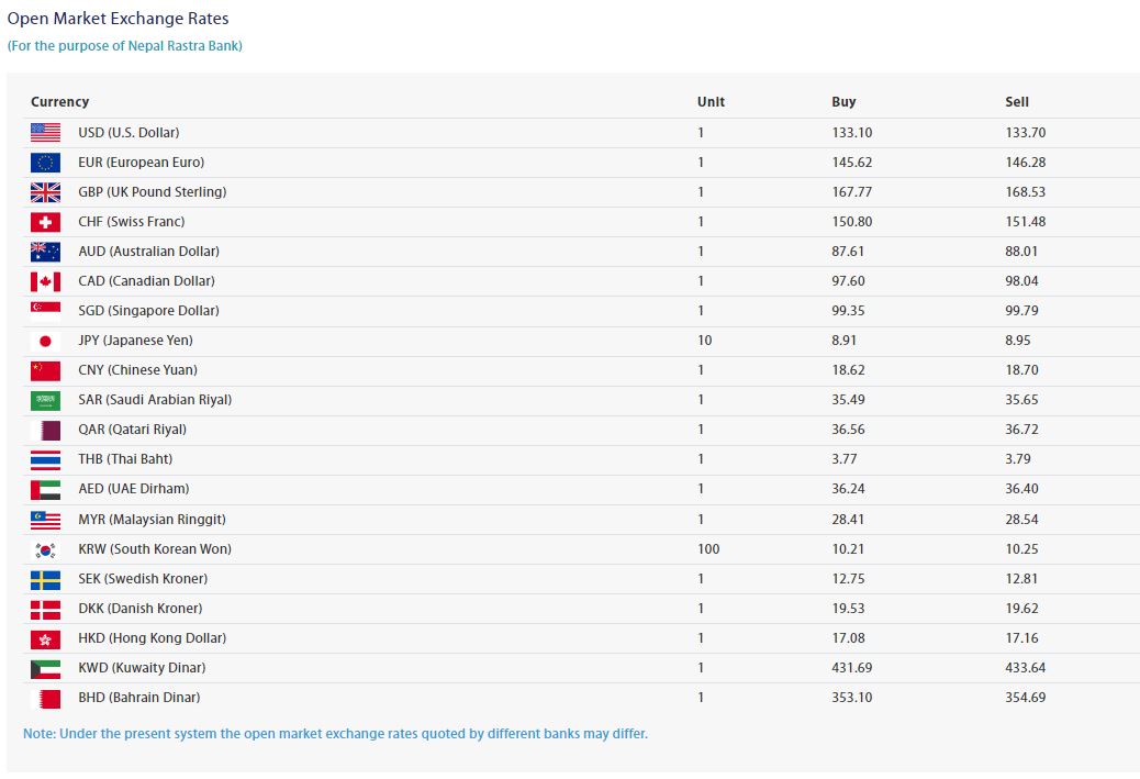 बेलायती पाउण्ड एकको खरिद दर १६७ रुपैयाँ ७७ पैसा र बिक्री दर १६८ रुपैयाँ ५३ पैसा कायम हुदाँ राष्ट्र बैंकले अष्ट्रे्लियन डलर एकको खरिद दर ८७ रूपैयाँ ६१ पैसा तथा बिक्री दर ८८ रूपैयाँ ०१ पैसा, क्यानेडियन डलर ९७ रूपैयाँ ६० पैसा तथा बिक्री दर ९८ रूपैयाँ ०४ पैसामा कारोबार गर्न अनुमति दिएको छ । जापानी येन १० को खरिददर ८ रूपैयाँ ९१ पैसा तथा बिक्री दर ८ रूपैयाँ ९५ पैसा बराबर भाउ पाउँदा चाइनिज युआन १ को खरिद दर १८ रूपैयाँ ६२ पैसा तथा बिक्री दर १८ रूपैयाँ ७० पैसा कायम गरिएको छ । साउदी रियाल १ को खरिद दर ३५ रूपैयाँ ४९ पैसा तथा बिक्रि दर ३५ रूपैयाँ ६५ पैसा, युएइ दिराम १ को खरिददर ३६ रूपैयाँ २४ पैसा तथा बिक्री दर ३६ रूपैयाँ ४० पैसा कायम हुदाँ कतारी रियालको मूल्य एकको खरिद दर ३६ रुपैयाँ ५६ पैसा र बिक्री दर ३६ रुपैयाँ ७२ पैसामा कारोबार गर्न सकिने राष्ट्र बैंकले जनाएको छ ।