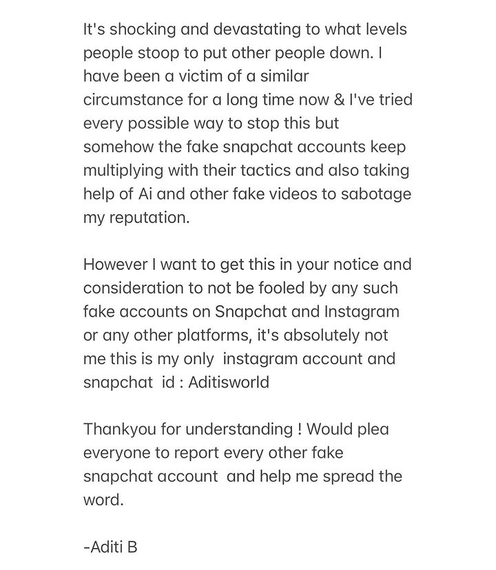 अदितीले लेखेकी छिन्, ‘अरु मानिसहरूलाई खसाल्न केही मान्छेहरूले गरेको प्रयास देख्दा मलाई निकै दुख लागेको छ । लामो समयदेखि मैले यस्तो हर्कत र प्रयासको सामना गरिरहेको छु । मैले यसलाई रोक्ने प्रयास पनि गरिरहेकी छु । नक्कली स्न्यापच्याट आइडीबाट यस्तो काम भइरहेको छ । साथै, एआई र अरू गलत भिडियोको माध्यमबाट मेरो चरित्र हत्या गर्ने काम भइरहेको छ ।’पछिल्लो समय कृत्रिम बौद्धिकता (एआई)को प्रयोग गरेर बनाइएका भिडियो र तस्वीर सेयर गर्ने क्रम बढेको छ । यसको मारमा नाम चलेका बलिउड अभिनेत्रीहरु रश्मिका मन्दाना, आलिया भट्ट र काजोल एआईद्वारा निर्मित डीप–फेक भिडियोको सिकार बनिसकेका छन् ।