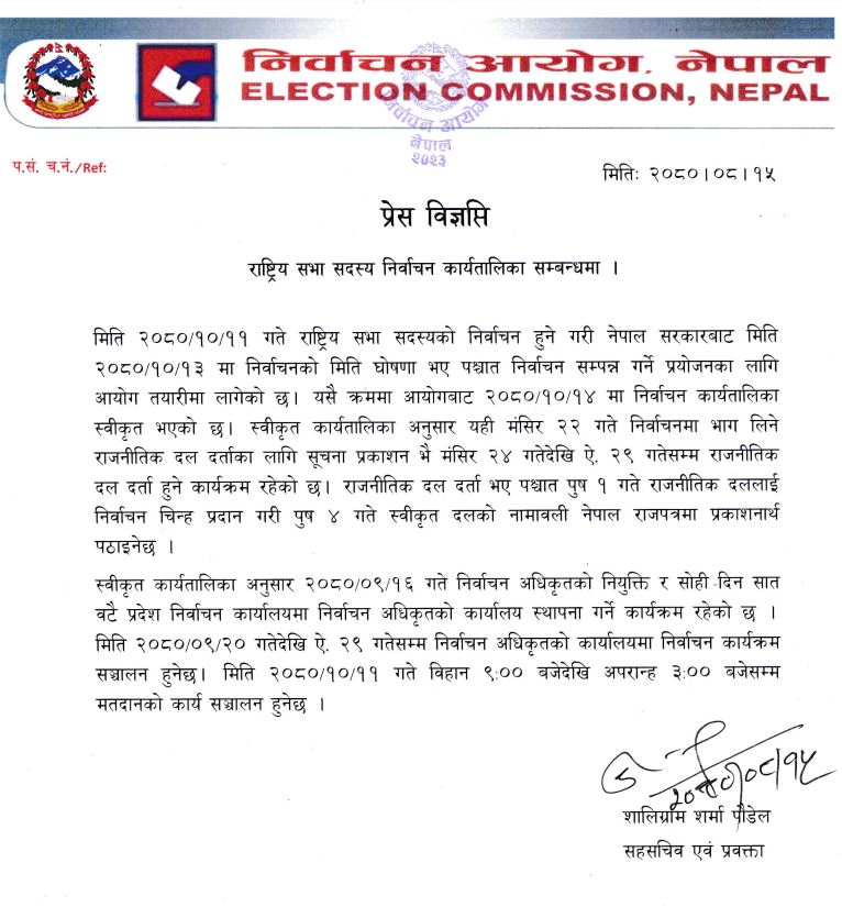 २०८० माघ ११ गते राष्ट्रिय सभा सदस्यको निर्वाचन हुने गरी नेपाल सरकारबाट मिति २०८० माघ १३ मा निर्वाचनको मिति घोषणा भए पश्चात निर्वाचन सम्पन्न गर्ने प्रयोजनका लागि आयोग तयारीमा लागेको जनाएको छ । सो तयारी स्वरुप आयोगबाट २०८० माघ १४ मा निर्वाचन कार्यतालिका स्वीकृत भएको जनाएको हो ।