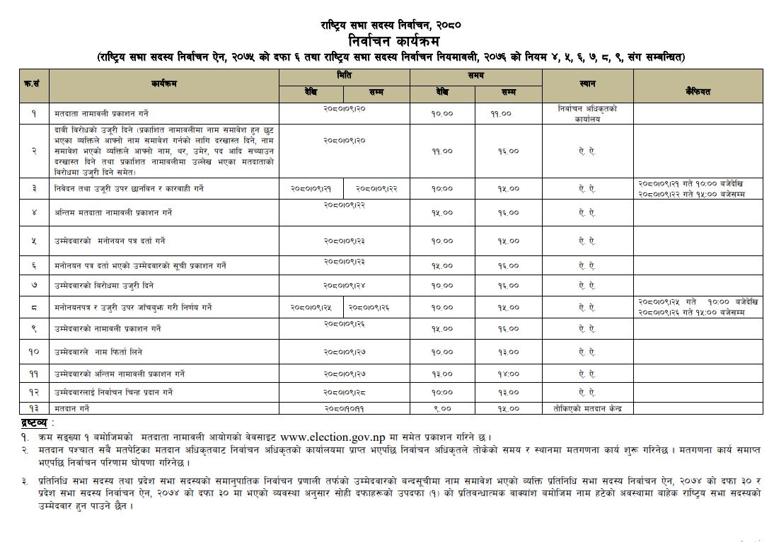 काठमाडौं । निर्वाचन आयोगले राष्ट्रिय सभा सदस्य निर्वाचनका लागि पुस २३ गते उम्मेदवारी दर्ता गराउने भएको छ । आयोगले माघ ११ गते हुन गइरहेको निर्वाचन कार्यक्रम स्वीकृत गर्दै पुस २३ गतेका लागि उम्मेदवारी दर्ताको समयसिमा जानकारी गराएको हो ।आयोगका आगामी पुष २० गते निर्वाचन अधिकृतको कार्यालयले राष्ट्रियसभा निर्वाचनका लागि मतदाता नामावली प्रकाशित गर्नेछ ।