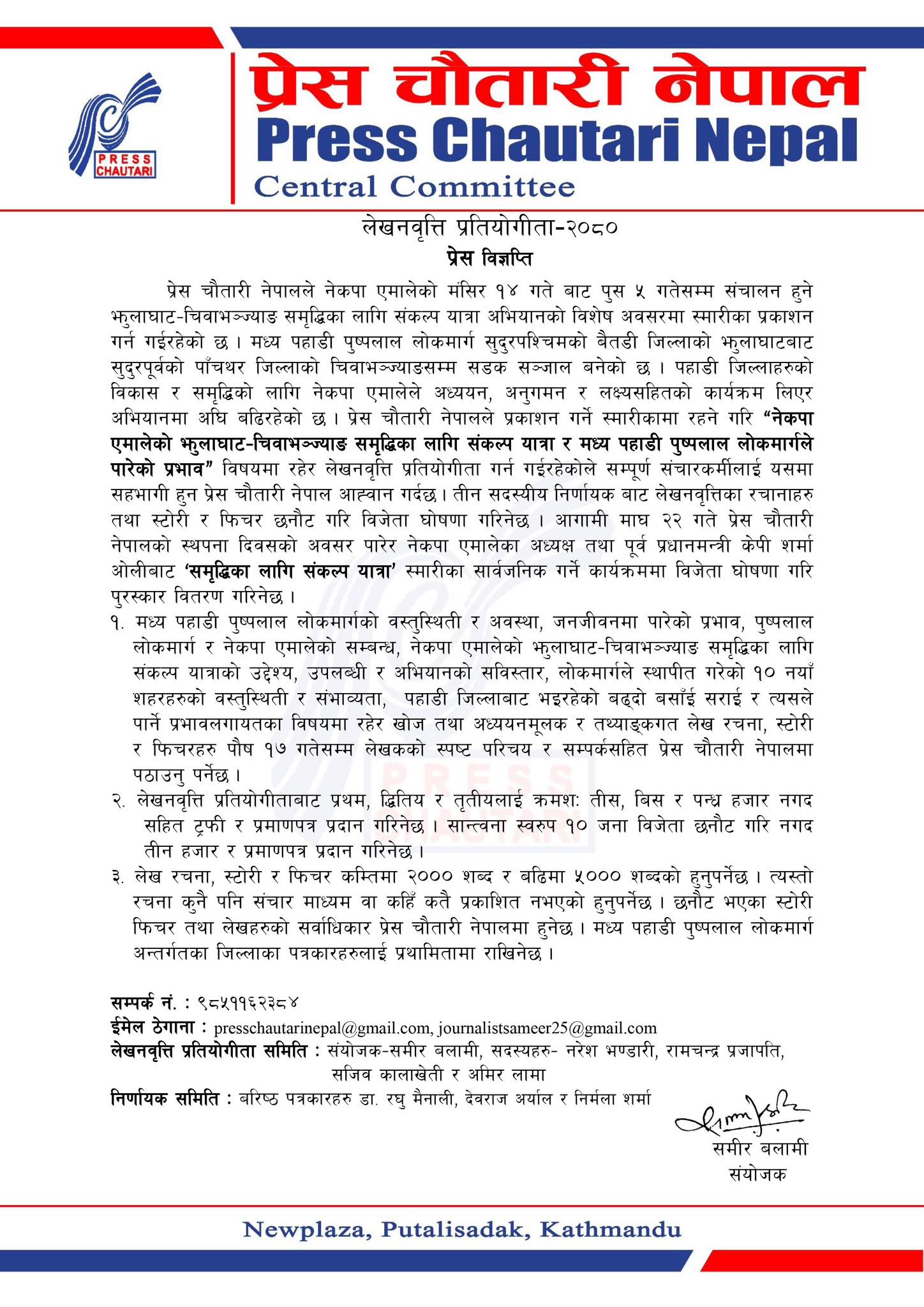 मंगलवार प्रेस विज्ञप्ति जारी गर्दै पौष १७ गते भित्र “नेकपा एमालेको झुलाघाट–चिवाभञ्ज्याङ समृद्धिका लागि संकल्प यात्रा र मध्य पहाडी पुष्पलाल लोकमार्गले पारेको प्रभाव” विषयमा रहेर स्टोरी र फिचर लेखि प्रेस चौतारी नेपालको इमेल आईडी presschautarinepal@gmail.com र journalistsameer25@gmail.com मा पठाउन आह्वान गरेको छ । साथै ९८५११६२३८४ नं. को भाईवर वा वाट्सएपमा समेत लेख पठाउन सकिने प्रेस चौतारीले जनाएको छ । प्रतियोगिताको लागि डा. रघु मैनालीको संयोजकत्वमा देवराज आर्यल र निर्मला शर्मा रहेको तीन सदस्यीय निर्णायक समिति गठन गरेको विज्ञप्तिमा उल्लेख छ । प्रतियोगिताबाट प्रथम, द्धितिय र तृतियका साथै १० वटा सान्त्वना लेखहरु छनौट हुने जनाएको छ । प्रथम, द्धितिय र तृतियलाई क्रमश तीस, बिस र पन्ध्र हजारका साथै सान्त्वनामा तीन हजारसहित ट्रफी र प्रमाण पत्र प्रदान गरिने संयोजक समीर बलामीले बताएका छन् ।