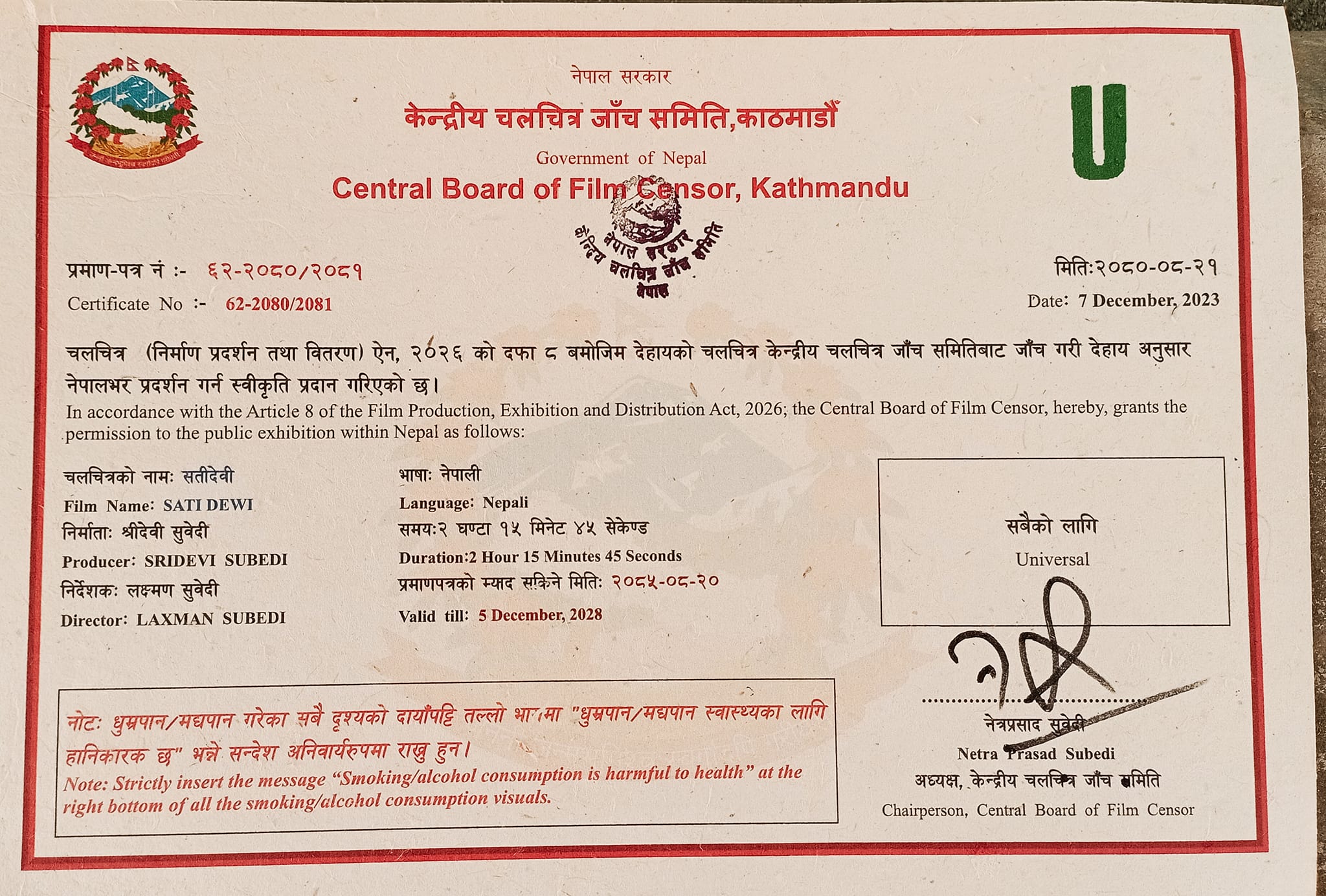 काठमाडौं । पत्रकार तथा फिल्म निर्देशक लक्ष्मण सुबेदीको फिल्म केन्द्रिय चलचित्र जाँच समितिवाट पास भएको छ ।निर्देशक सुबेदीका अनुसार चलचित्र सतीदेवीले युनिभर्सल (यु) सर्टिफिकेट पाएको छ ।