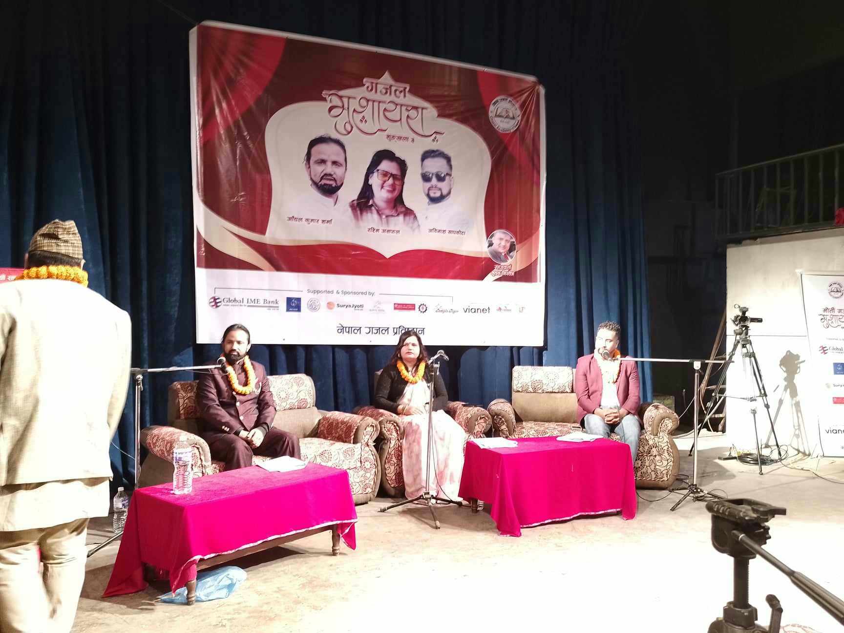 यसअघि गजल मुशायरा- १ मा डा. प्रदीपकुमार मैनाली, आवाज शर्मा र शान्ति शर्मा प्रस्तुत भएका थिए भने गजल मुशायरा- २ मा राधा कणेल, अनजान यात्री र मिलनकुमार ढुङ्गानालाई प्रस्तुत गरिएको थियो । प्रमुख अतिथि गजलकार करुण थापाले अब नेपाली गजल रदिफ, काफिया र लयभन्दा माथि उठेर भाव र शिल्प परिष्कारतर्फ बढेको भन्दै खुसी व्यक्त गरे ।
