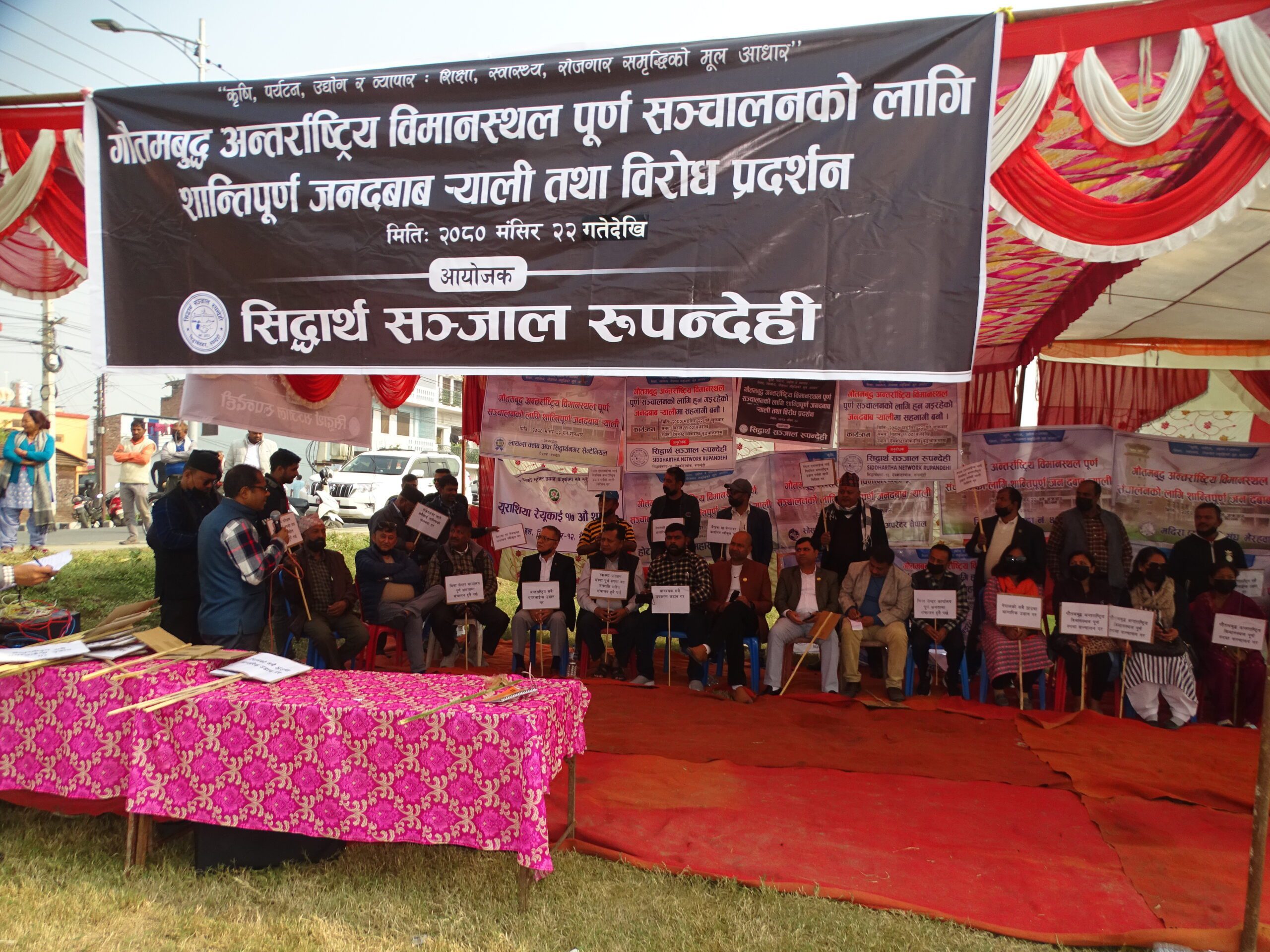 मोहम्मद हबिबभैरहवा। रुपन्देहीका संघ संस्था तथा व्यवसायीहरुले गौतमबुद्ध विमानस्थल अगाडि अनिश्चितकालिन धर्ना बसेका छन्। लामो समयदेखि अन्तर्राष्ट्रिय उडान स्थगित भएको विमानस्थल पूर्ण क्षमतामा संचालनको माग गर्दै आइतबारबाट सिद्धार्थ सञ्जाल रुपन्देहीको नेतृत्वमा विरोधको कार्यक्रम सुरु भएको हो । चरणबद्ध आन्दोलन गरिरहेको सञ्जालले नियमित अन्तर्राष्ट्रिय उडान गर्न पटक–पटक सरकारलाई दवाव दिँदै आएपनि सुनुवाई नभएकोले बाध्य भएर धर्नाको कार्यक्रम अघि सारेको सञ्जालका अध्यक्ष अनिल कुमार ज्ञवालीले बताए ।