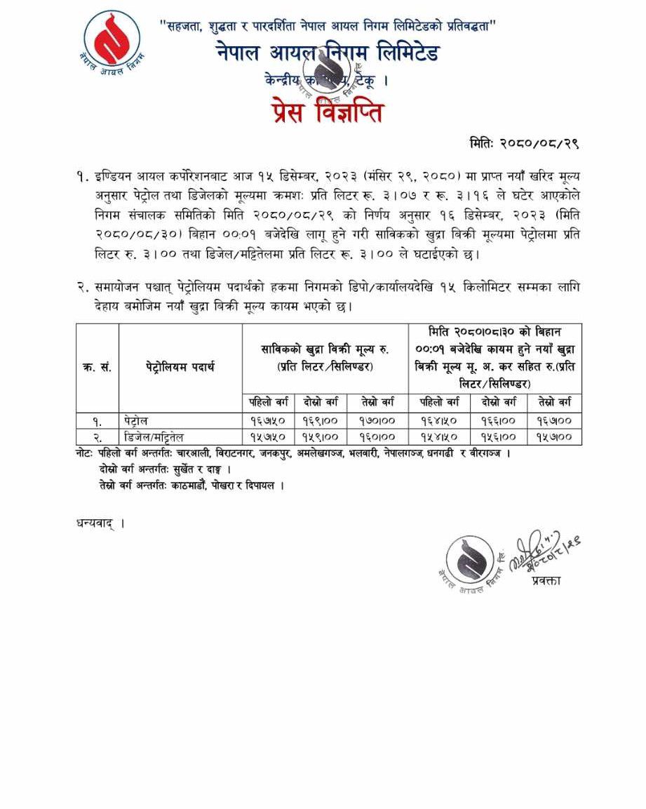 काठमाडौं । नेपाल आयल निगमले पेट्रोलियम पदार्थको मूल्य घटाएको छ। शुक्रबार एक विज्ञप्ति जारी गर्दै निगमले पेट्रोल, डिजेल र मट्टितेलमा प्रतिलिटर ३/३ रुपैयाँ घटाइएको जनाएको छ।घटाइएको नयाँ मूल्य शनिबार बिहान १ बजेदेखि लागू हुनेछ। नयाँ मूल्य अनुसार अब पेट्रोल प्रतिलिटरमा १६७, डिजेल र मट्टितेल १५७ रुपैयाँ पर्नेछ।