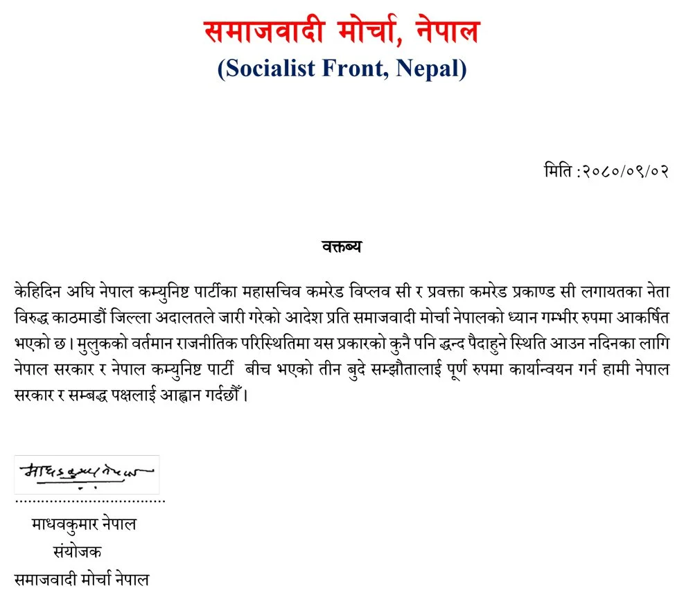 ‘केही दिन अघि नेपाल कम्युनिस्ट पार्टीका महासचिव कमरेड विप्लव सी र प्रवक्ता कमरेड प्रकाण्ड सी लगायतका नेता विरुद्ध काठमाडौँ जिल्ला अदालतले जारी गरेको आदेश प्रति समाजवादी मोर्चा नेपालको ध्यान गम्भीर रूपमा आकर्षित भएको छ। मुलुकको वर्तमान राजनीतिक परिस्थितिमा यस प्रकारको कुनै पनि द्वन्द्व पैदा हुने स्थिति आउन नदिनका लागि नेपाल सरकार र नेपाल कम्युनिस्ट पार्टीबिच भएको तीन बुँदे सम्झौतालाई पूर्ण रूपमा कार्यान्वयन गर्न हामी नेपाल सरकार र सम्बद्ध पक्षलाई आह्वान गर्दछौँ,’ जारी विज्ञप्तिमा भनिएको छ ।
