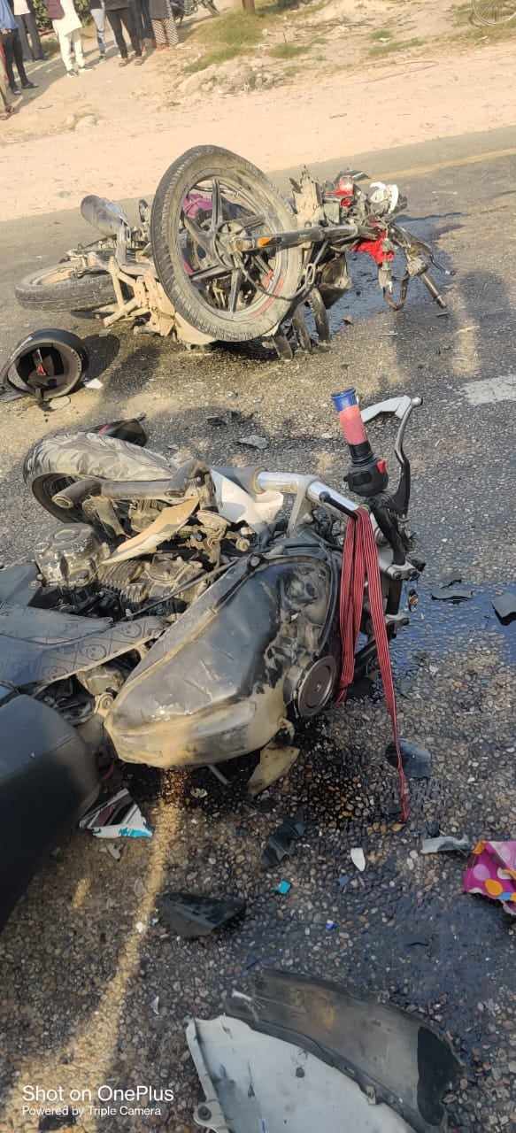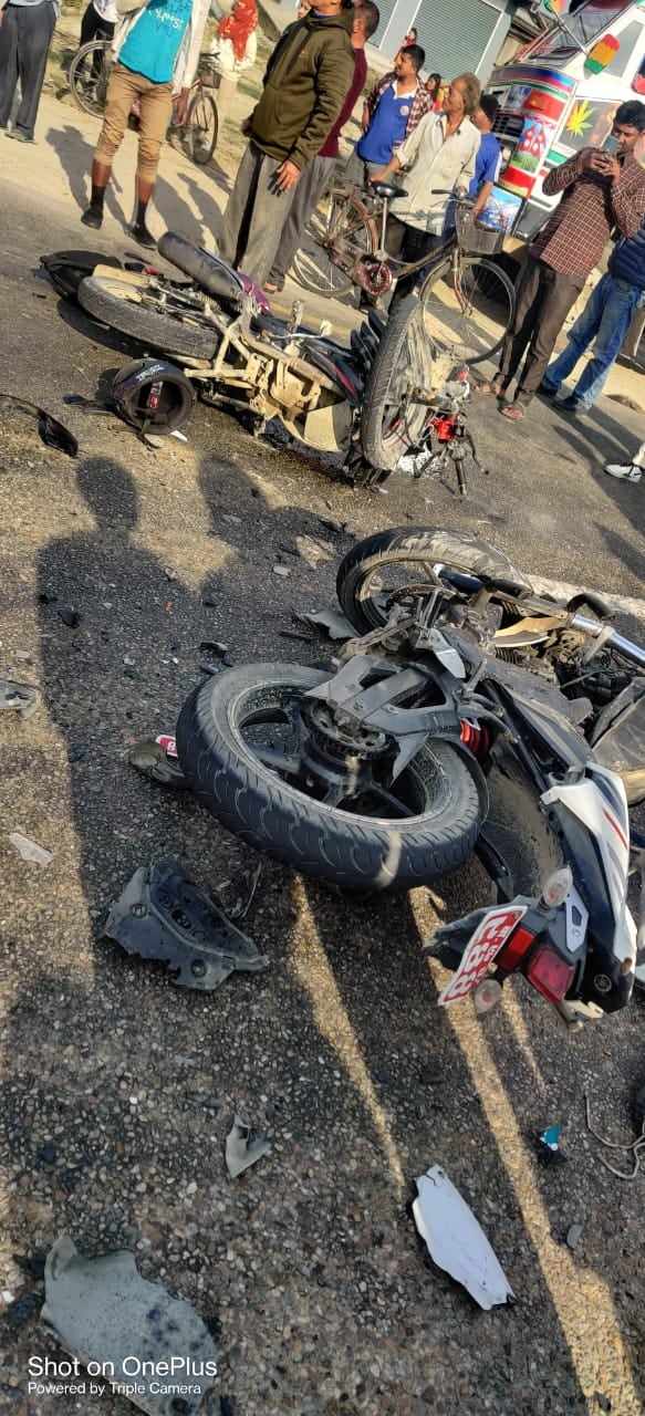 बारा । बाराको निजगढ नगरपालिकामा मोटरसाइकल एकआपसमा ठोक्किँदा दुई जनाको मृत्यु भएको छ । उक्त दुर्घटनामा एकजना घाइते भएका छन् ।रौतहटबाट निजगढ तर्फ आउँदौ गरेको बा ९७ प ९४४ नम्बर र विपरीत दिशाबाट रौतहट जाँदै गरेको प्रदेश १–०५ ००१प ५४९७ नम्बरको मोटरसाइकल एकआपसमा ठक्कर खाई दुर्घटना हुँदा दुवै मोटरसाइकल चालकको मृत्यु भएको ईलाका प्रहरी कार्यालय निजगढले जनाएको छ ।