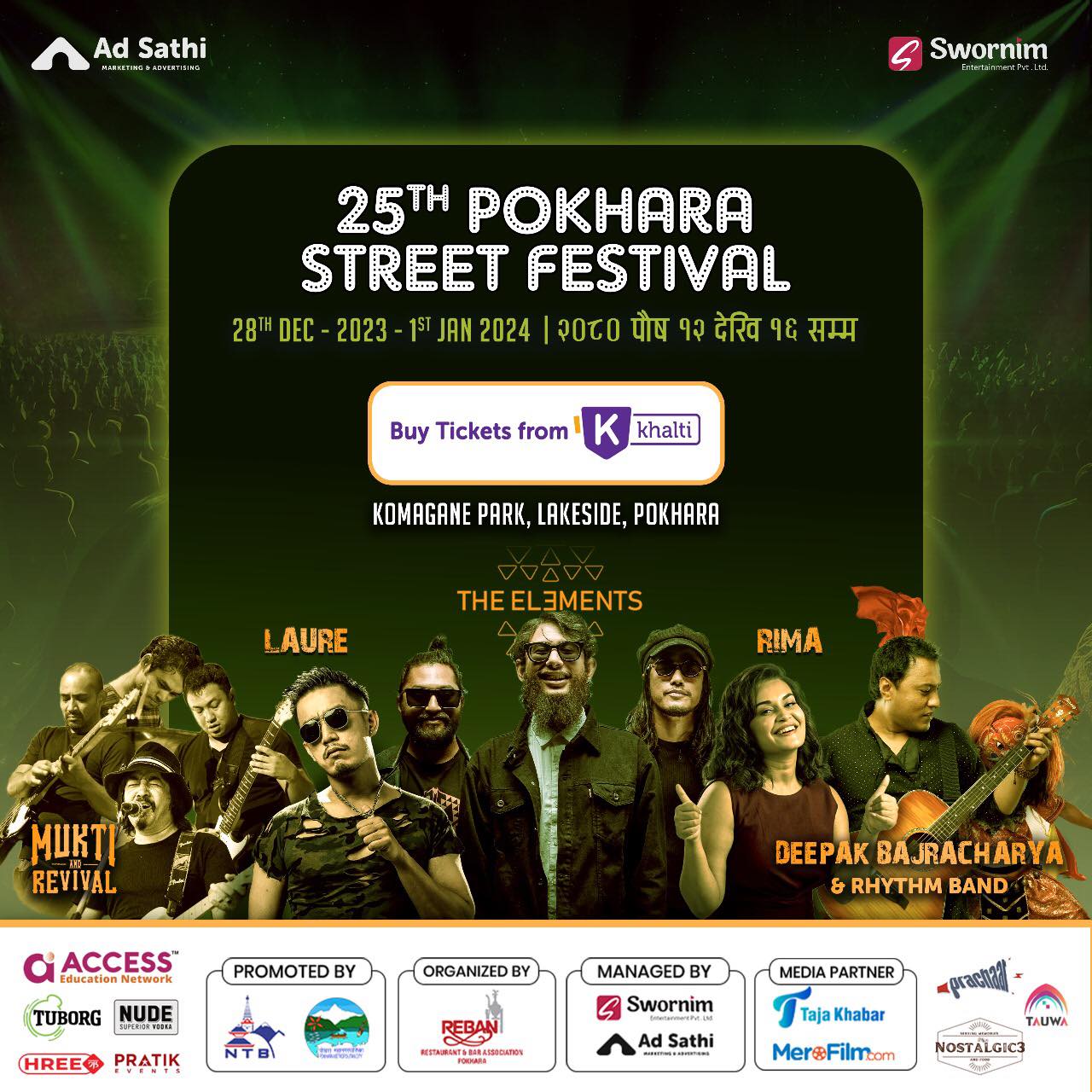 काठमाडौं । अङ्ग्रेजी नयाँ वर्ष २०२४ को अवसरमा विगतका वर्षहरूमा जस्तै यस वर्ष पनि पोखरामा भव्य ‘स्ट्रिट फुड फेस्टिभल’ कार्यक्रमको आयोजना हुने भएको छ । महोत्सव आयोजक रेस्टुरेन्ट एन्ड बार एसोसिएसन (रेवान) ले यहीँ पुस १२ गतेदेखि पुस १६ गतेसम्म ४ दिन सडक महोत्सव हुने जानकारी दिएको हो। महोत्सव आयोजनाको रजत वर्ष भएकाले यसपटक महोत्सवलाई आफूहरुले विशेष बनाउन  सोही अनुसारको विशेष तयारी आफूहरुले गरेको जानकारी दिइएकाे छ  ।‘सडकमै खाउँ, सडकमै रमाउँ’ भन्ने मूल नारासहित आयोजना हुने यस महोत्सव पोखराको लेक साइडसम्मको करिब ३ किमी क्षेत्रमा आयोजना हुनेछ ।रेवान अध्यक्षले महोत्सवको तयारी सकिएको र पोखरा पर्यटकहरुलाई स्वागत गर्न तयार भएर बसेको बताए’२५ वर्ष पहिले हाम्रा अग्रजहरुले पोखरालाई मुख्य पर्यटकीय मौसममा मात्र नभई सालैभर घूमघामको गन्त्बय बनाउनुपर्छ भनेर यसको सुरुवात गर्नुभएको थियो। आज यो देशकै सबैभन्दा ठूलो सडक महोत्सव बनेको छ। यो रजत वर्ष अझ विशेष बनाउनेछौं’, रेवान अध्यक्ष भट्टराईले भने ।महोत्सवको मुख्य आकर्षणको रूपमा विभिन्न जातजातिको सांस्कृतिक कार्यक्रम, मौलिक भेषभुषा प्रदर्शनसँगै राष्ट्रिय तथा अन्तर्राष्ट्रिय खानाको प्रदर्शन, दोहोरी गीत प्रतियोगिता, झाँकी प्रदर्शन, रात्रिकालीन कन्सर्ट, बोट रेस, बेटर रेस, टग अफ वार, भलिबल प्रतियोगिता, सचेतनामूलक सडक नाटक, सेल्फी फोटो बुच, पोखराको पर्यटनको विकास, प्रवर्द्धन, अवसर तथा चुनौतीहरुको विषयमा केन्द्रीकृत गरी टक सो कार्यक्रम, स्वदेशी उत्पादित हस्तकला, चित्रकला, मूर्तिकला तथा कृर्ष, वनस्पति लगायतका कृर्षि उपजहरूको प्रदर्शन गरिने आयोजकले जनाएको छ ।लेक साइडको तीन किलोमिटर लामो सडक क्षेत्रमा हुने गतिविधी सबैका लागि नि:शुल्क हो भने सांगीतक कार्यक्रम हुने कोमा जाने पार्क प्रवेशका लागि भने टिकट काट्नु पर्नेछ।आयोजकले यसपटक स्टेज शोका लागि खल्ती एप बाट अनलाइन टिकट काट्न सकिने व्यवस्था गरेको छ। यस्तै विदेशी कार्डहरुबाट आफन्त तथा साथीभाइका लागिसमेत टिकट काट्न सकिने व्यवस्था मिलाइएको जानकारी आयोजकले दिएका छन्। खल्टीले अनलाइनबाट टिकटको बिक्री सुरु गरिसकेको छ।महोत्सवको २५ औं वर्ष भएकाले यसपटक हल्लन चोकदेखि कन्सर्ट आयोजना स्थलसम्म विशेष आरती र शिव ताण्डव नृत्य प्रस्तुत गरिनेछ। यस्तै, ५ दिनसम्म राष्ट्रिय स्तरका चर्चित कलाकारहरु आउने यो महोत्सवलाई रीमा विश्वकर्माले होस्ट गर्नेछिन्।महोत्सवको न्यू इयर इभमा र्‍यापर लाउरे र  द एलिमेन्ट्स ब्यान्डको प्रस्तुति दिनेछन् भने डिसेम्बर ३० तारिखमा मुक्ती एन्ड रिभाइबल ब्यान्डको धमाकेदार प्रस्तुति रहनेछ। त्यसैगरी डिसेम्बर २९ तारिखमा ‘ओ अमिरा’ तथा ‘म