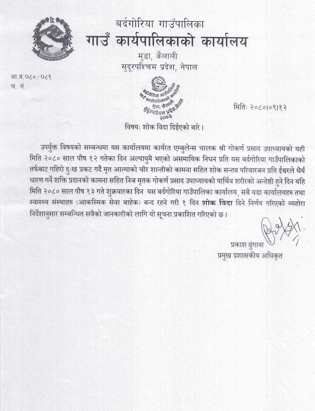 एम्बुलेन्स चालक गोकर्ण प्रसाद उपाध्यायको यही मिति २०८० साल पौष १२ गतेका दिन अल्पायुमै भएको असमायिक निधन प्रति बर्दगोरिया गाउँपालिकाले गहिरो दुःख प्रकट गर्दै शोक बिदा दिएको हो ।