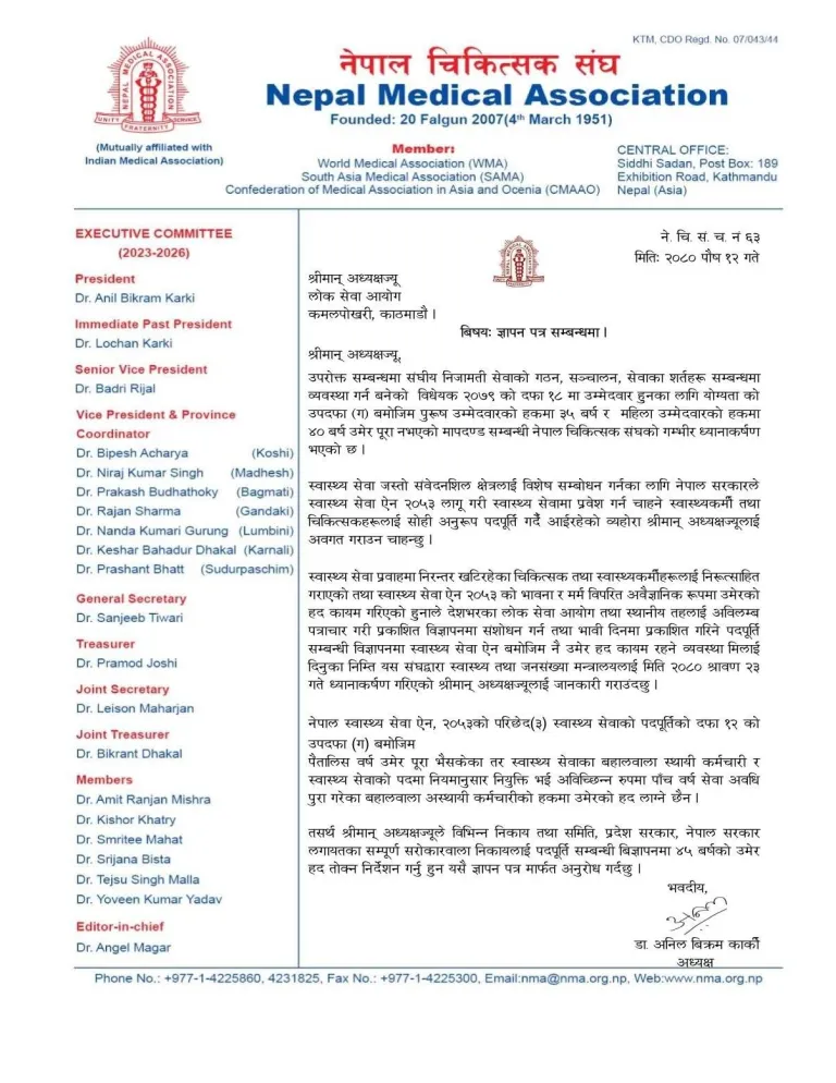 काठमाडौं । स्वास्थ्य सेवातर्फ संघ प्रदेश तथा स्थानीय तहले गर्ने पदपूर्तिमा उमेर हद फरक-फरक भएको विषयमा नेपाल चिकित्सक संघले एक रूपता कायम गर्न माग गर्दै लोकसेवा आयोगको ध्यानाकर्षण गराएको छ। बिहीबार संघका अध्यक्ष डा. अनिलबिक्रम कार्कीको नेतृत्वमा गएको टोलीले लोक सेवा आयोगका अध्यक्ष माधवप्रसाद रेग्मीलाई भेटी ज्ञापनपत्र बुझाएको हो।