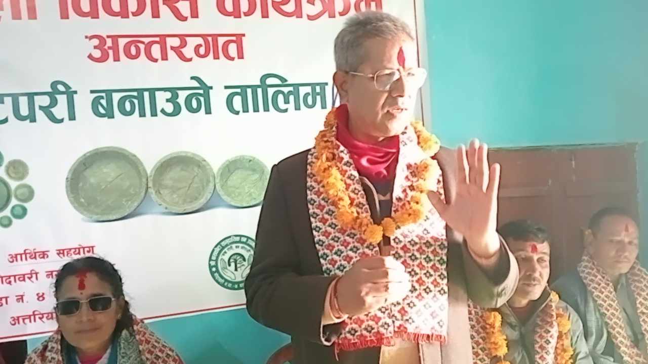 अत्तरिया । कैलालीको गोदावरी नगरपालिका – ४ मा दुना टपरी बनाउने तालिम सम्पन्न भएको छ । महिला विकास कार्यक्रम अन्तरगत गोदावरी नगरपालिका – ४ को आर्थिक सहयोगमा बास्कोटा सामुदायिक वनले १ हप्ते तालिमको आयोजना गरेको थियो । शनिबार देखि सुरु भएको तालिमको एक कार्यक्रमका बीच गोदावरी नगरपालिकाका नगर प्रमुख बिरेद्र भट्ट र वडा न ४ का वडा अध्यक्ष हेम प्रकाश मल्लले तालिममा सहभागिलाई प्रमाण पत्र वितरण गरी कार्यक्रमको समापन गरियो ।