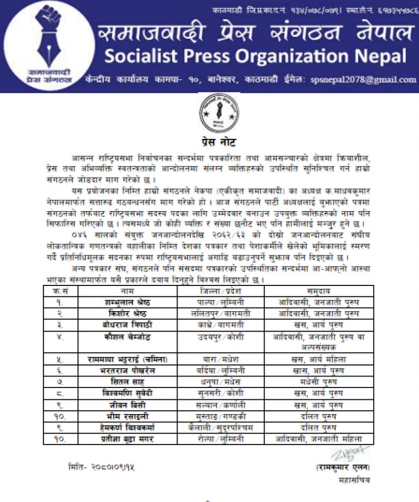 काठमाडौं। नेकपा एकीकृत समाजवादीनिकट समाजवादी प्रेस संगठनले राष्ट्रिय सभा सदस्य निर्वाचनका लागि १० जना पत्रकारको नाम सिफारिस गरेको छ । आगामी ११ माघमा हुन लागेको राष्ट्रिय सभा सदस्य निर्वाचनको उम्मेदवारका लागि समाजवादी प्रेस संगठनले शम्भुलाल श्रेष्ठ, किशोर श्रेष्ठ, बोधराज त्रिपाठी, कौशल चेम्जोङ, राममाया भट्टराई, भरतराज पोखरेल, शीतल साह, विश्वमणि सुवेदी, जीवन बिसी, भीम रसाइली, हेमकर्ण विश्वकर्मा र प्रतीज्ञा बूढा मगरलाई सिफारिस गरेको हो ।