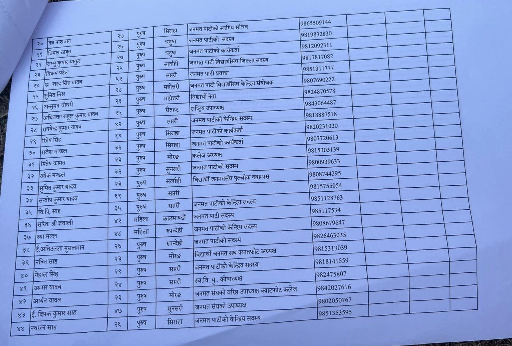 काठमाडौं। संघीय मामिला तथा सामान्य प्रशासनमन्त्री अनिता देवी, जनमत पार्टी अध्यक्ष सिके राउतसहित ५३ जना पक्राउ परेका छन् । ‘राष्ट्रिय धोती दिवस’ भन्दै निकालिएको ¥याली निषेधित क्षेत्र माइतीघरमा प्रवेश गर्न खोजेपछि प्रहरीले उनीहरुलाई नियन्त्रणमा लिएको हो । नियन्त्रणमा लिएकाहरुलाई महेन्द्र पुलिस क्लबमा राखिएको छ ।