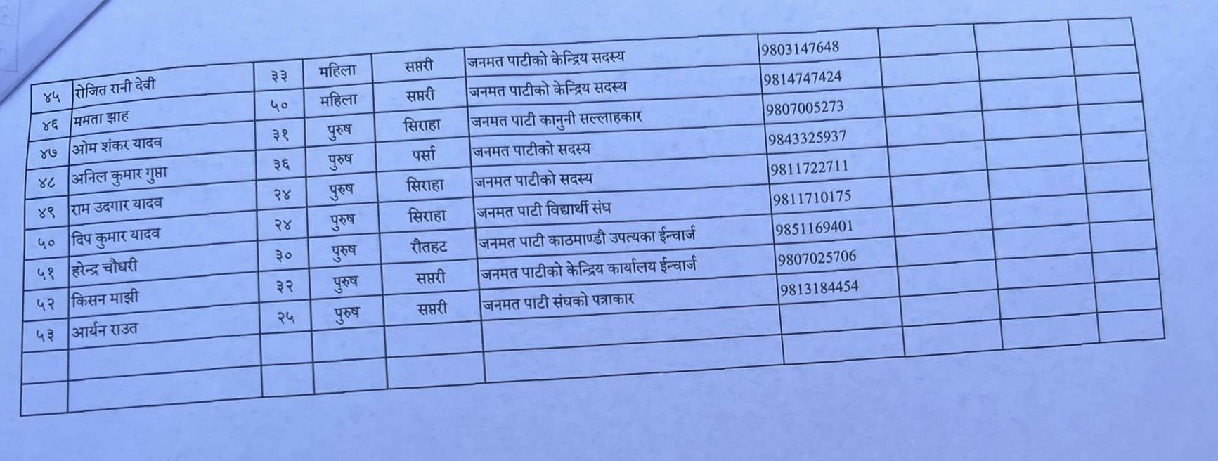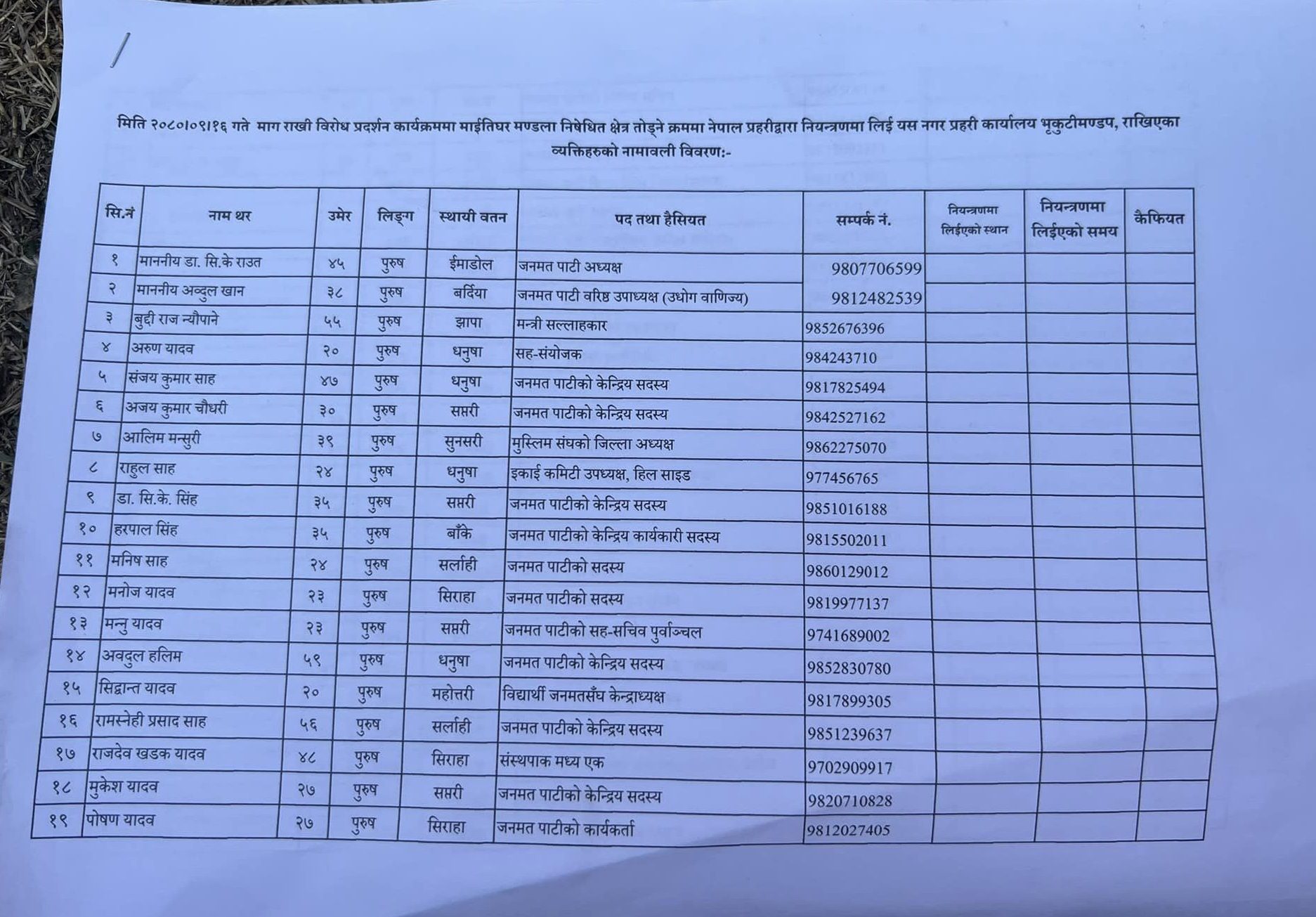 काठमाडौं। संघीय मामिला तथा सामान्य प्रशासनमन्त्री अनिता देवी, जनमत पार्टी अध्यक्ष सिके राउतसहित ५३ जना पक्राउ परेका छन् । ‘राष्ट्रिय धोती दिवस’ भन्दै निकालिएको ¥याली निषेधित क्षेत्र माइतीघरमा प्रवेश गर्न खोजेपछि प्रहरीले उनीहरुलाई नियन्त्रणमा लिएको हो । नियन्त्रणमा लिएकाहरुलाई महेन्द्र पुलिस क्लबमा राखिएको छ ।