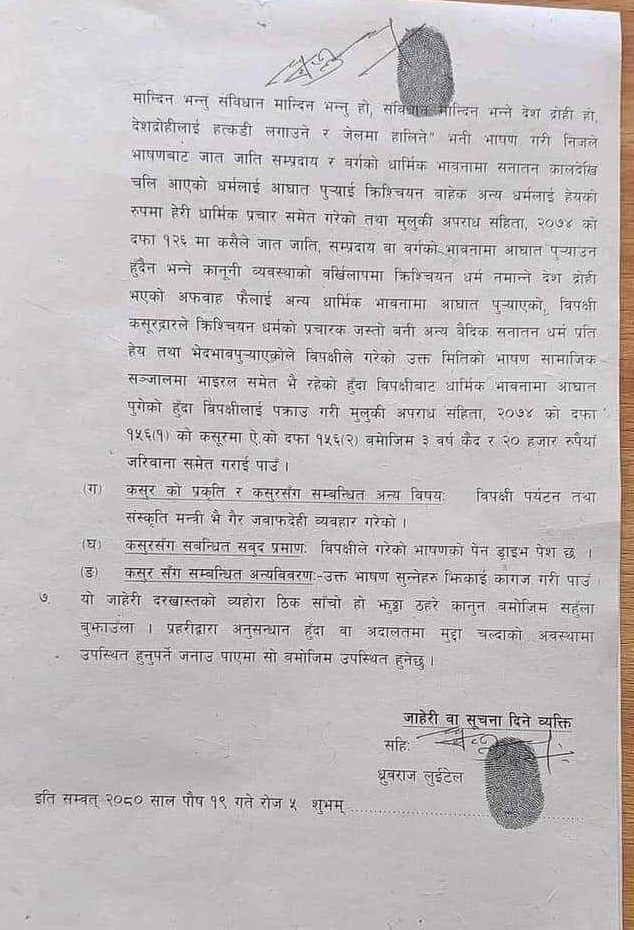 क्रिश्चियनवाहेक अन्य धर्मलाई हेयको रुपमा हेरी धार्मिक प्रचार समेत गरेको तथा मुलुकी अपराध संहिता, २०७४ को दफा १२६ मा कसैले जात जाति, सम्प्रदाय वा वर्गको भावनामा आघात पुर्याउन हुँदैन भन्ने कानुनी व्यवस्थाको बर्खिलापमा क्रिश्चियन धर्म नमान्ने देश द्रोही भएको अफवाह फैलाई अन्य धार्मिक भावनामा आघात पुर्याएको, विपक्षी कसूरदारले क्रिश्चियन धर्मको प्रचारक जस्तो बनी अन्य वैदिक सनातन धर्मप्रति हेय तथा भेदभावपुर पुर्याएकोले विपक्षीले गरेको उक्त मितिको भाषण सामाजिक सञ्जालमा भाइरल समेत भै रहेको हुँदा विपक्षीबाट धार्मिक भावनामा आघात पुगेको हुँदा विपक्षीलाई पक्राउ गरी मुलुकी अपराध संहिता, २०७४ को दफा १५६(१) को कसूरमा ऐ. को दफा १५६ (२) बमोजिम ३ वर्ष कैद र २० हजार रुपैयाँ जरिवाना समेत गराई पाउँ,’ निवेदकमा उल्लेख गरिएको छ ।