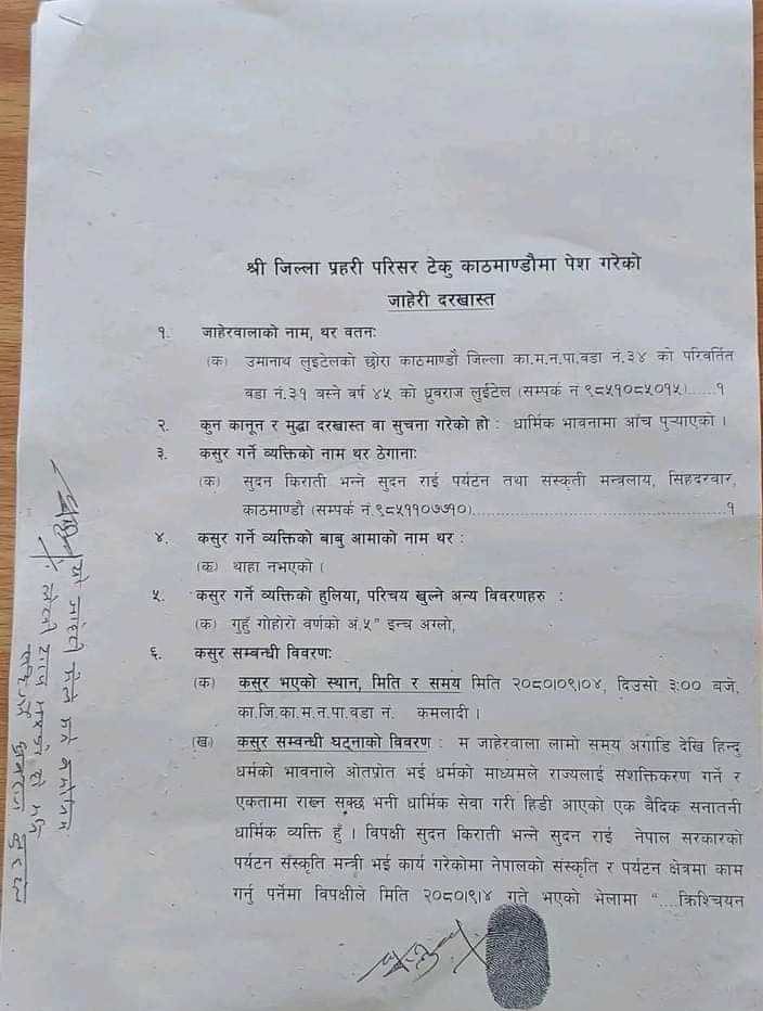 काठमाडौं। संस्कृति, पर्यटन तथा नागरिक उड्डयनमन्त्री सुदन किराँतीविरुद्ध धार्मिक भावनामा आँच पुर्याएको भन्दै उजुरी परेको छ । काठमाडौंका ध्रुवराज लुईंटेलले मन्त्री किराँतीविरुद्ध जिल्ला प्रहरी परिसर काठमाडौंमा उजुरी दिएका हुन् । यही ४ पुसमा प्रज्ञा भवन कमलादीमा आयोजित सार्वजनिक कार्यक्रममा मन्त्री किराँतीले दिएको अभिव्यक्तिले धार्मिक भावना आघात पुगेकाले उनलाई पक्राउ गरी ३ वर्ष कैद र २० हजार रुपैयाँ जरिमाना गराउन निवेदक लुईंटेलले माग गरेका छन् । ‘म जाहेरवाला लामो समय अगाडिदेखि हिन्दु धर्मको भावनाले ओतप्रोत भई धर्मको माध्यमले राज्यलाई सशक्तिकरण गर्ने र एकतामा राख्न सक्छ भनी धार्मिक सेवा गरी हिडी आएको एक वैदिक सनातनी धार्मिक व्यक्ति हुँ । विपक्षी सुदन किराती भन्ने सुदन राई नेपाल सरकारको पर्यटन संस्कृति मन्त्री भई कार्य गरेकोमा नेपालको संस्कृति र पर्यटन क्षेत्रमा काम गर्नु पर्नेमा विपक्षीले मिति २०८०/९/१४ गते भएको भेलामा क्रिश्चियन मान्दिन ‘भन्नुु संविधान मान्दिन भन्नु हो, संविधान मान्दिन भन्ने देश द्रोही हो, देशद्रोहीलाई हत्कडी लगाउने र जेलमा हालिने भनी भाषण गरी निजले भाषणबाट जात जाति सम्प्रदाय र वर्गको धार्मिक भावनामा सनातन कालदेखि चलिआएको धर्मलाई आघात पुर्याई