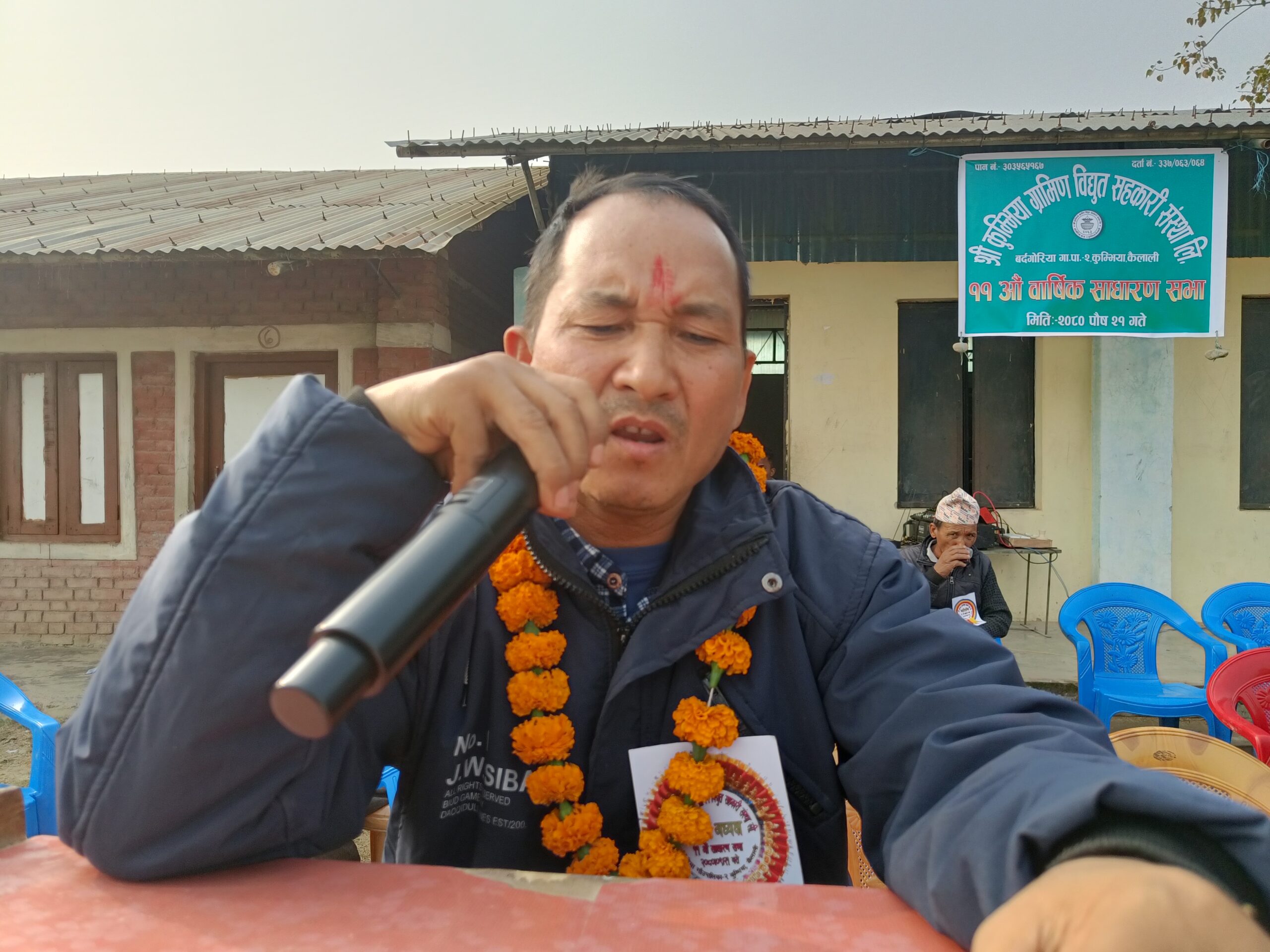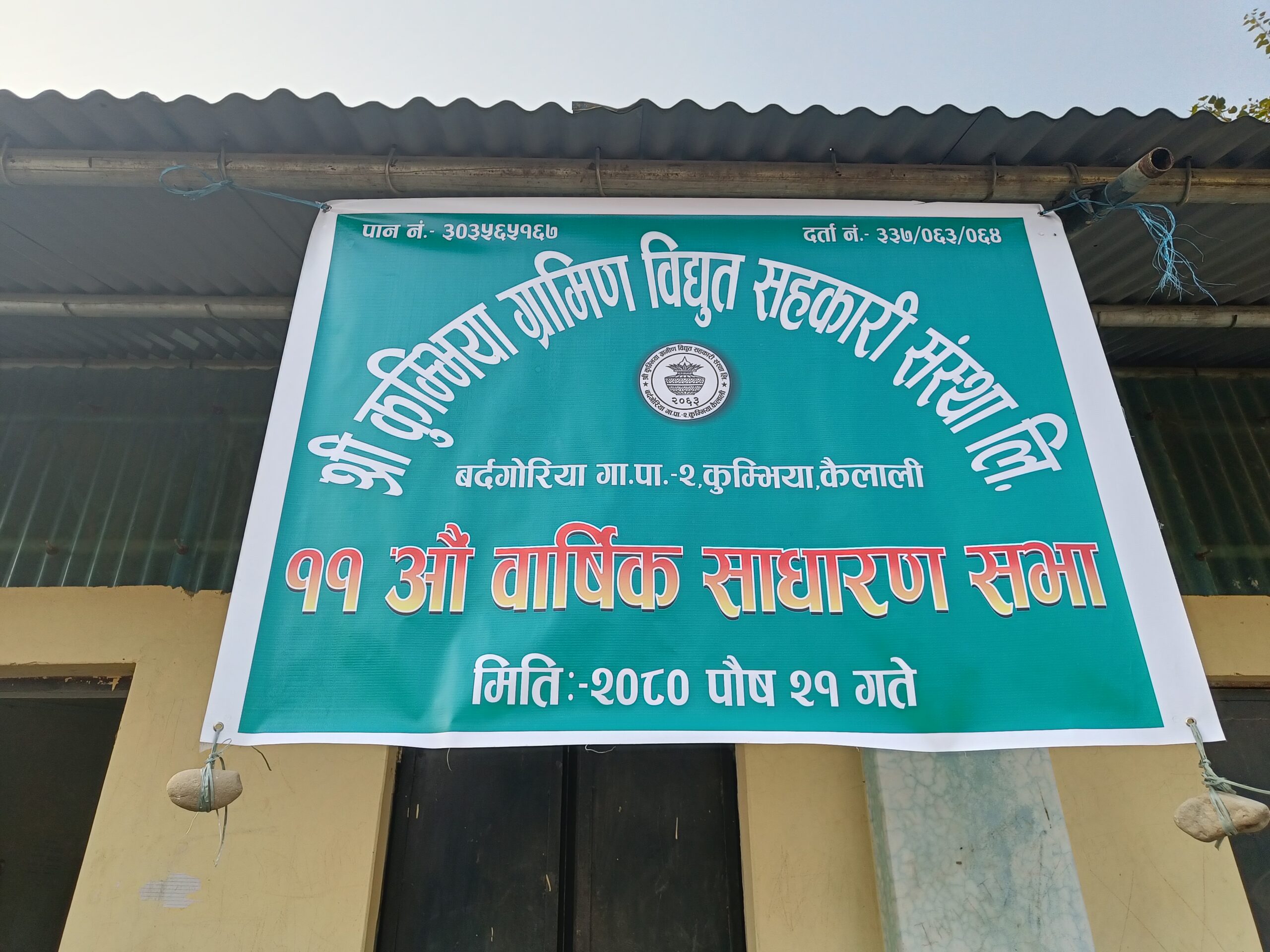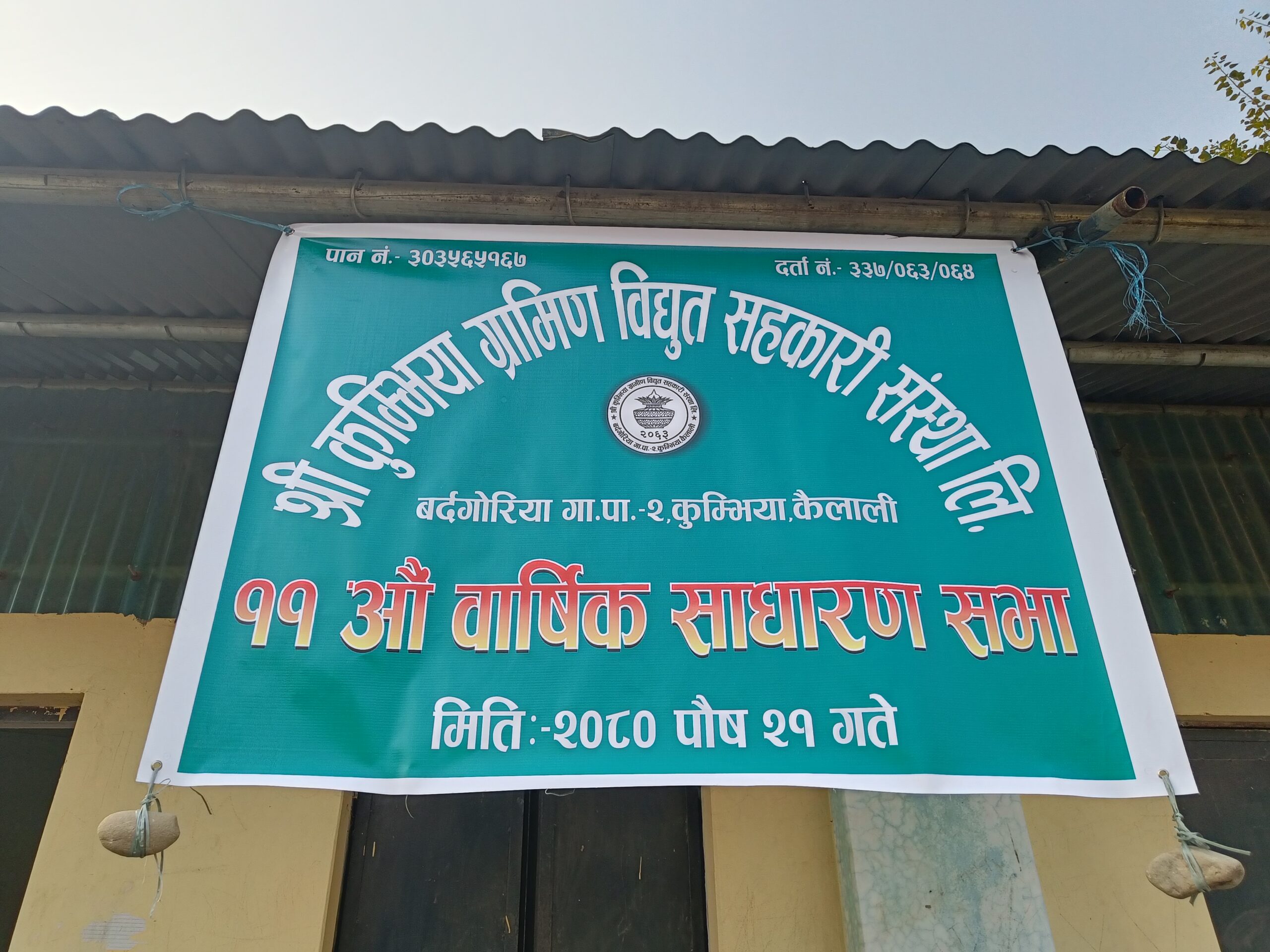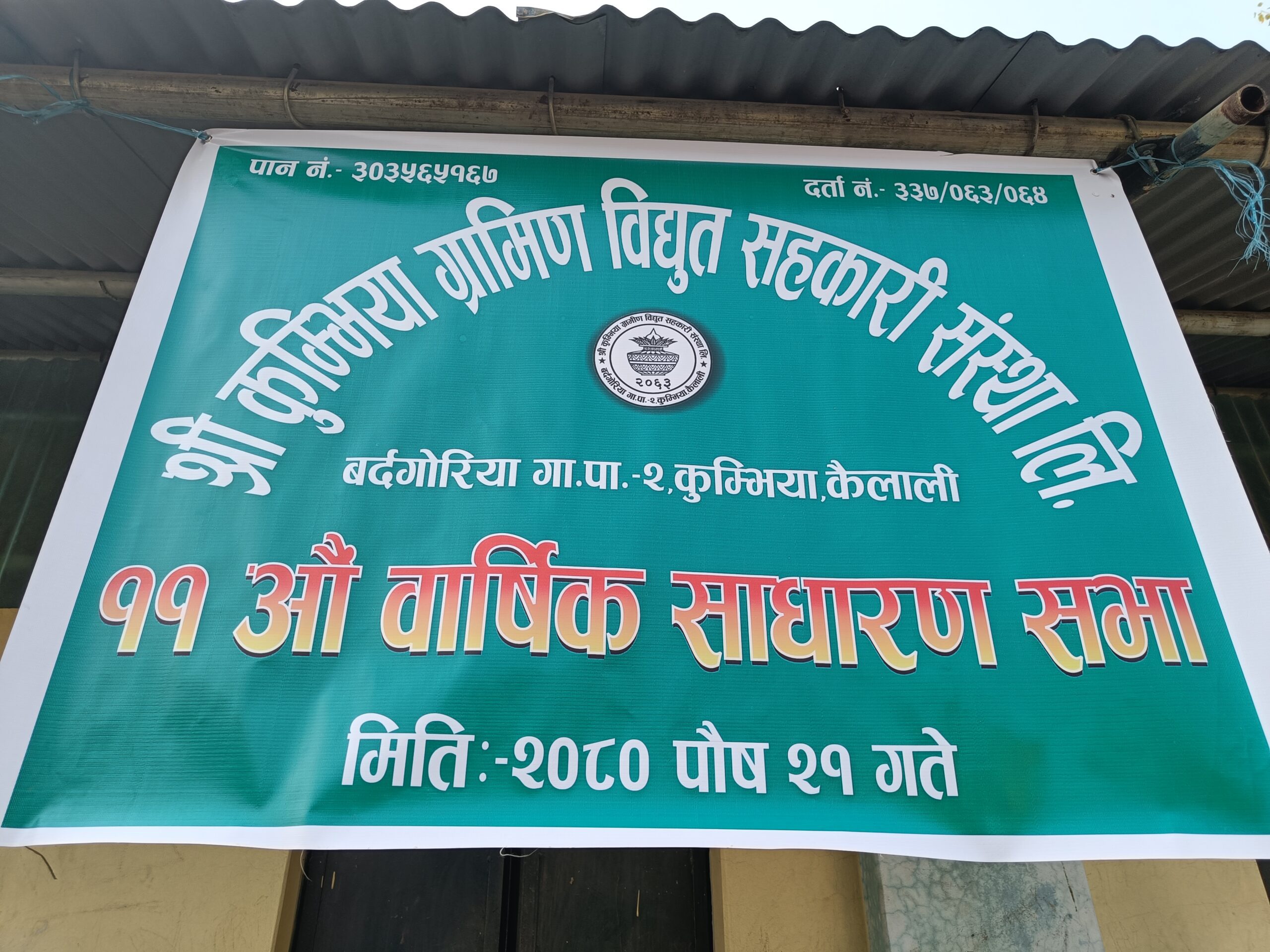 कैलाली । कैलाली जिल्लाको बर्दगोरिया गाउँपालिका वडा नं २ मा रहेको कुम्भिया ग्रामीण बिद्युत सहकारी संस्थाको एघारौँ वार्षिक साधारण सभा शनिवार सम्पन्न भएको छ ।संस्थाका अध्यक्ष खकेन्द्र रानामगरको सभापतित्वमा भएको कार्यक्रममा बर्दगोरिया गाउँपालिका वडा न २ का वडा अध्यक्ष गोविन्द विक प्रमुख अतिथि रहनुभएको थियो । त्यस्तै विशिष्ट अतिथिमा महालक्ष्मी ग्रामिण विद्युत सहकारी संस्थाका अध्यक्ष अमर बहादुर बम, गाउँका भलमभंसा गेदुवा डगौरा थारु र गाउँका समाजसेवी तथा बुद्धिजीवी उपेन्द्र बम रहनुभएको थियो। संस्थाका कार्यालय प्रबन्धक दीपक नेपालीले आर्थिक वर्ष २०७९/०८० को करिब २३ लाख ९ हजार ३ सय ७४ रुपैँया १० पैंसा बराबरको आर्थिक प्रतिवेदन प्रस्तुत गर्नुभएको थियो।त्यस्तै संस्थामा नियमित प्रतेक महिनाको १६ गते भित्र बिधुत महसुल तिर्ने सर्व उत्कृष्ट शिव प्रसाद चौधरी, लोग बहादुर विक र मिना अधिकारीलाई राइस कुकर पुरस्कार वितरण गरिएको थियो भने महिनाको २५ गते भित्र विद्युत महसुल तिर्न १० जनालाई सी •एफ •एल • चिप सान्तोना पुरस्कार पाउन सफल भएका मक्कु डगौरा थारु, राजाराम डगौरा थारु, प्रतिभा चाैधरी, डम्मर बम, कृषाल चाैधरी, लौटन चौधरी, नारायण डगौरा थारू, विमला विक, रघुवीर डगौरा थारु र चन्दर चाैधरीलाई पुरस्कृत गरिएको थियो। कार्यक्रममा शान्ति सामुदायिक वन उपभोक्ता समूहका उपाध्यक्ष मनिराम डगौरा थारु, पिरुवा सामुदायिक वन उपभोक्ता समूहका अध्यक्ष पार्वती बम, मङ्गलमय युवा क्लबका अध्यक्ष निरज चौधरी, लेखा समितिका संयोजक राम डगौरा थारु, सदस्य जहर सिंह आले र खेम राज बम लगायतको उपस्थिति थियो।संस्थाका उपाध्यक्ष राम शंखर डगौरा थारुको स्वागत मन्तव्य सँगै सुरु भएको कार्यक्रमको सञ्चालन संस्थाका सचिव दीपक बमले गर्नुभएको थियो। हाल सम्म उक्त संस्थामा ५३० जना शेयर सदस्यहरु रहेका छन् । कार्यक्रममा २७० जना उपभोक्ताहरुको सहभागीता रहेको थियो।