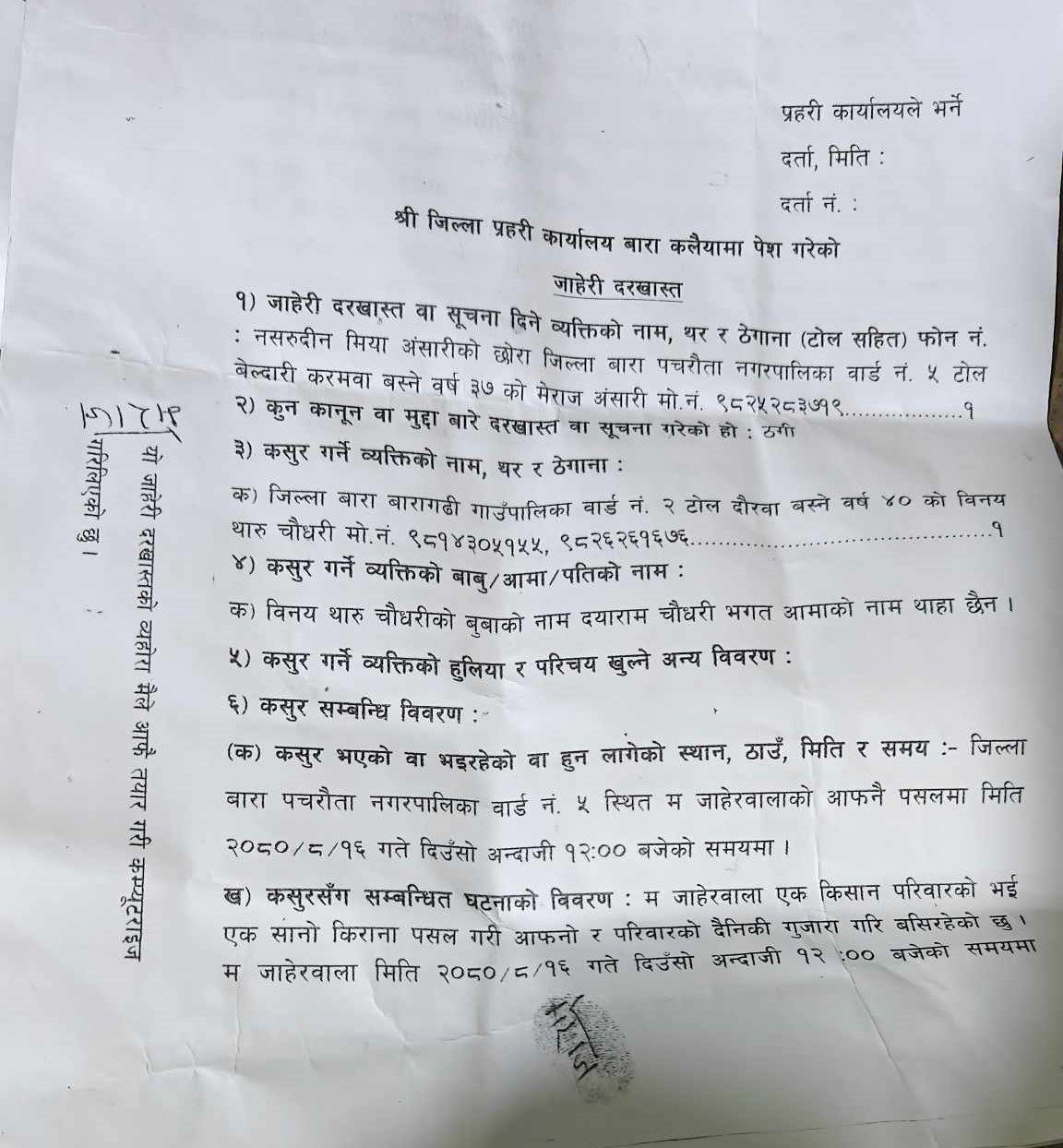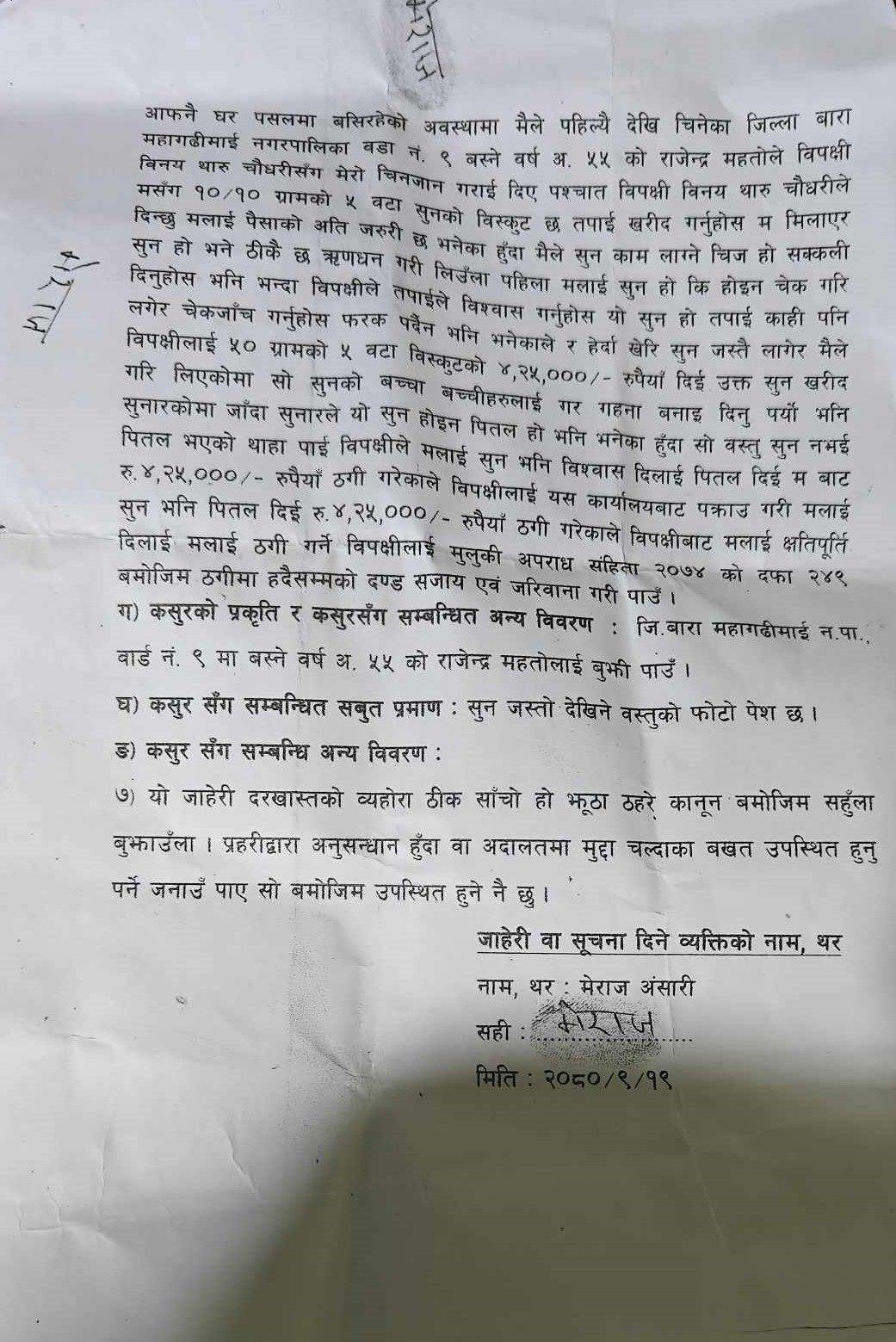 किराना पसल व्यवसाय गर्दै आएका अंसारीले मंसिर १६ गते चार लाख २५ हजारमा सुन भनेर १०/१० ग्रामको पाँच वटा बिस्कुट खरिद गरेका थिए। सुन भनेर किनेको उक्त बिस्कुट गहना बनाउन खोज्दा पित्तल निस्किएपछि अंसारी न्याय खोज्दै प्रहरी कार्यालय पुगेका छन्। यादवले ठगीमा संलग्न व्यक्तिलाई तत्काल नियन्त्रणमा लिएर कानुनी कारवाही अघि बढाउन आग्रह गरे। अंसारीले प्रहरीमा दिएको जाहेरीमा बारागढी गाउँपालिका वडा नम्बर २ दौरवा बस्ने ४० वर्षीय विनय थारु चौधरीसँग उक्त धातु खरिद गरेको उल्लेख गरेका छन्।