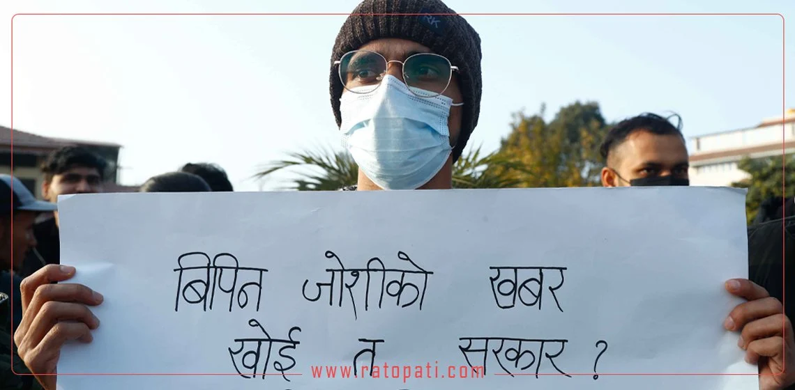 काठमाडौं । इजरायल–हमास युद्धका क्रममा बेपत्ता कञ्चनपुरका विपिन जोशीको सकुशल उद्धारको माग गर्दै राजधानीमा प्रदर्शन गरिएको छ। आइतबार बेपत्ता जोशीका आफन्त तथा साथीभाइहरूले सकुशल उद्धारको माग गर्दै प्रदर्शन गरेका हुन्। ललितपुरको लगनखेलबाट सुरु गरिएको र्‍याली जावलखेल पुगेर कोण सभामा परिणत भएको थियो।