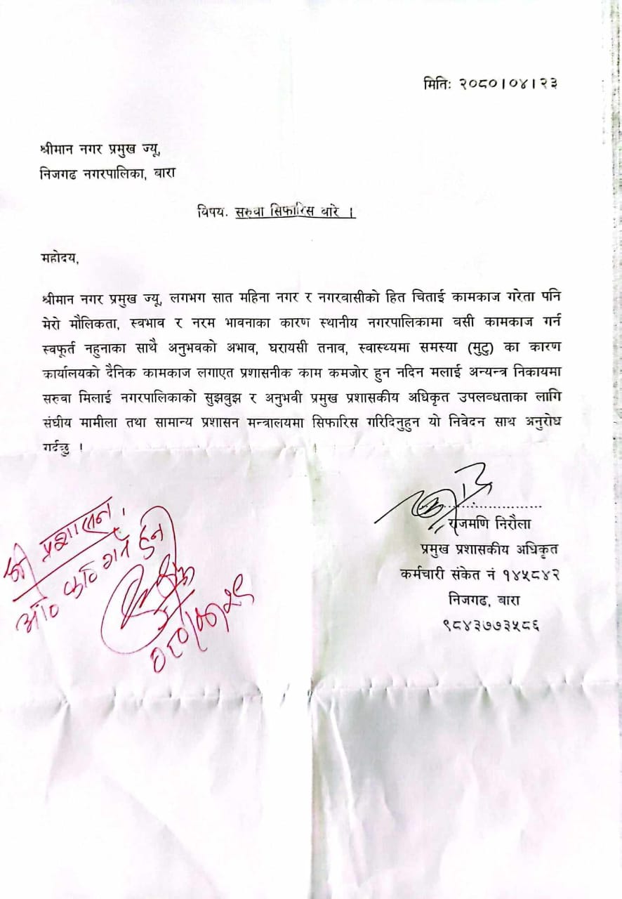 बारा । बाराको निजगढ नगरपालिकामा कार्यरत रहेका प्रमुख प्रशासकीय अधिकृत राजमणि निरौलाले २०८० साउन २३ गते निजगढ नगरपालिकाका प्रमुख सुरथ पुरीलाई पत्र लेख्दै अनुभवको अभाव, घरायसी तनाव र मुटुमा समस्या भएको बताउदै नगरपालिकामा स्वस्फुर्त काम गर्न नसकेको बताउँदै पत्र लेखे ।त्यसको केहि समयपछि निजगढ नगरपालिकाले प्रमुख प्रशासकीय अधिकृत निरौलाको पत्र र उनको स्वास्थ्य र व्यवहारीक समस्यालाई मध्यनजर गर्दै सरुवाको सहमति दिएको थियो ।