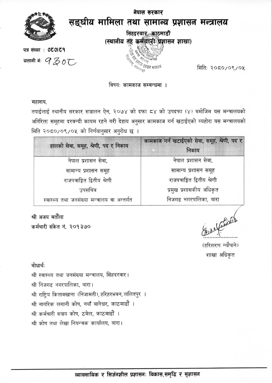 त्यसको करिब पाँच महिना पछि २०८० पुष ५ गते सङ्घीय मामिला तथा सामान्य प्रशासन मन्त्रालयले उनको सरुवा उनले भने अनुरुप सङ्घीय मामिला तथा सामान्य प्रशासन मन्त्रालयमा गरेको हो ।यता निजगढ नगरपालिकामा प्रमुख प्रशासकीय अधिकृत निरौला सरुवा भए लगतै सङ्घीय मामिला तथा सामान्य प्रशासन मन्त्रालयले स्वास्थ्य तथा जनसंख्या मन्त्रालयमा कार्यरत उपसचिव अजय बर्तौलालाई निजगढ नगरपालिकामा सरुवा गरेको थियो ।निजगढ नगरपालिकामा प्रमुख प्रशासकीय अधिकृतको रुपमा सरुवा भएका उपसचिव अजय बर्तौला सोमबार कार्यालयमा हाजिर समेत भईसकेका छन ।