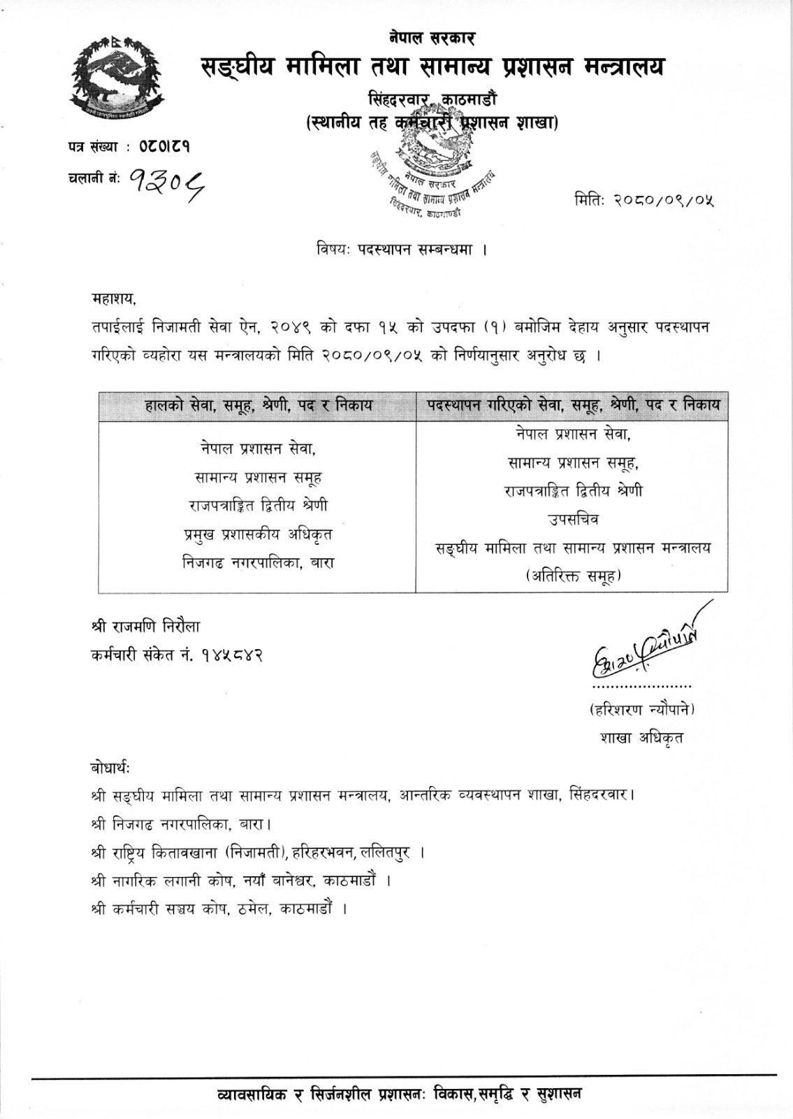 त्यसको करिब पाँच महिना पछि २०८० पुष ५ गते सङ्घीय मामिला तथा सामान्य प्रशासन मन्त्रालयले उनको सरुवा उनले भने अनुरुप सङ्घीय मामिला तथा सामान्य प्रशासन मन्त्रालयमा गरेको हो ।यता निजगढ नगरपालिकामा प्रमुख प्रशासकीय अधिकृत निरौला सरुवा भए लगतै सङ्घीय मामिला तथा सामान्य प्रशासन मन्त्रालयले स्वास्थ्य तथा जनसंख्या मन्त्रालयमा कार्यरत उपसचिव अजय बर्तौलालाई निजगढ नगरपालिकामा सरुवा गरेको थियो ।निजगढ नगरपालिकामा प्रमुख प्रशासकीय अधिकृतको रुपमा सरुवा भएका उपसचिव अजय बर्तौला सोमबार कार्यालयमा हाजिर समेत भईसकेका छन ।