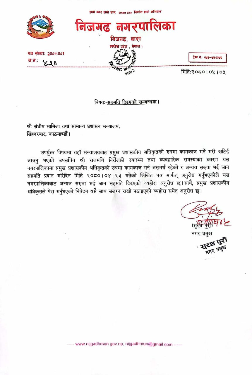 बारा । बाराको निजगढ नगरपालिकामा कार्यरत रहेका प्रमुख प्रशासकीय अधिकृत राजमणि निरौलाले २०८० साउन २३ गते निजगढ नगरपालिकाका प्रमुख सुरथ पुरीलाई पत्र लेख्दै अनुभवको अभाव, घरायसी तनाव र मुटुमा समस्या भएको बताउदै नगरपालिकामा स्वस्फुर्त काम गर्न नसकेको बताउँदै पत्र लेखे ।त्यसको केहि समयपछि निजगढ नगरपालिकाले प्रमुख प्रशासकीय अधिकृत निरौलाको पत्र र उनको स्वास्थ्य र व्यवहारीक समस्यालाई मध्यनजर गर्दै सरुवाको सहमति दिएको थियो ।