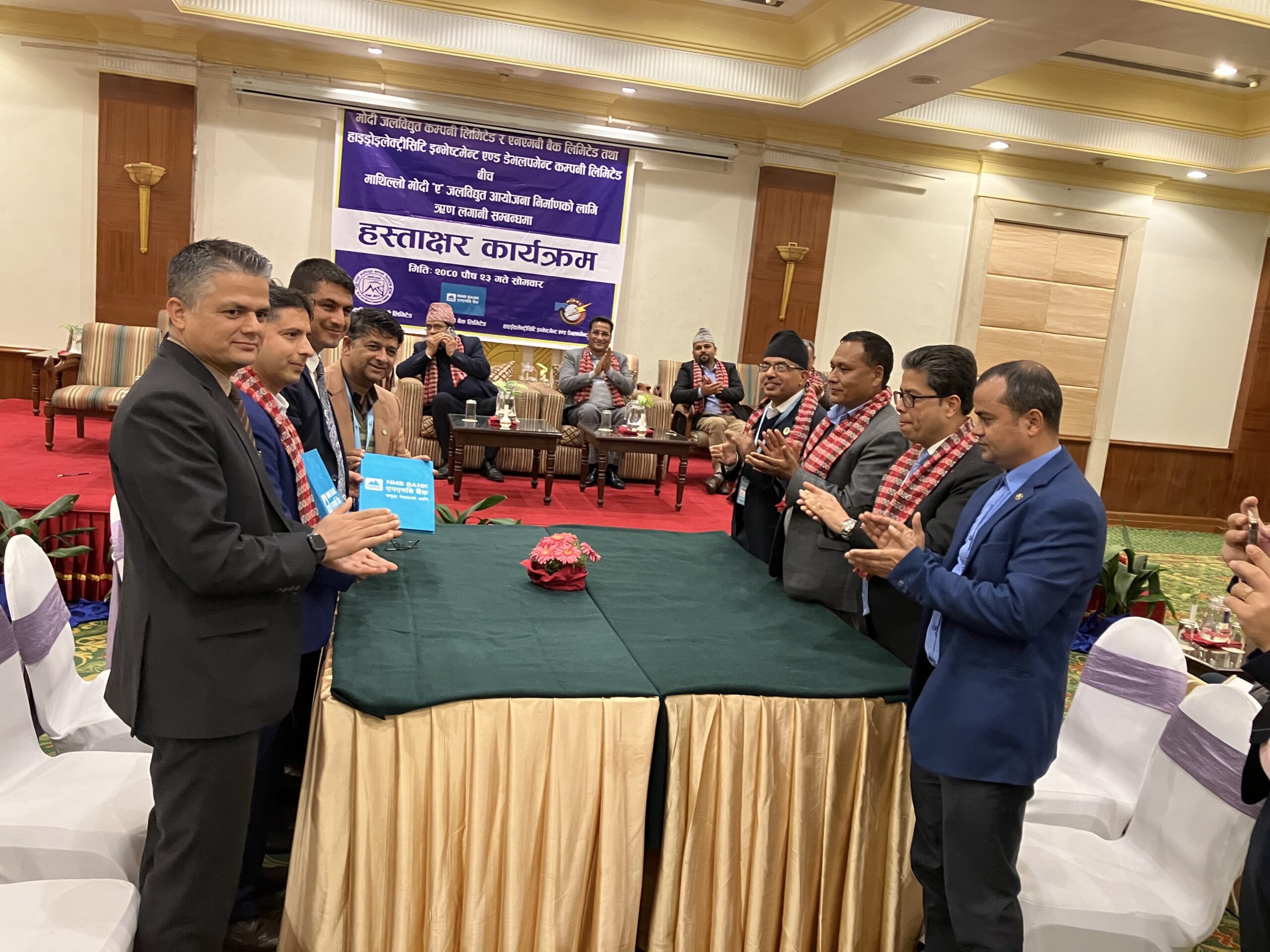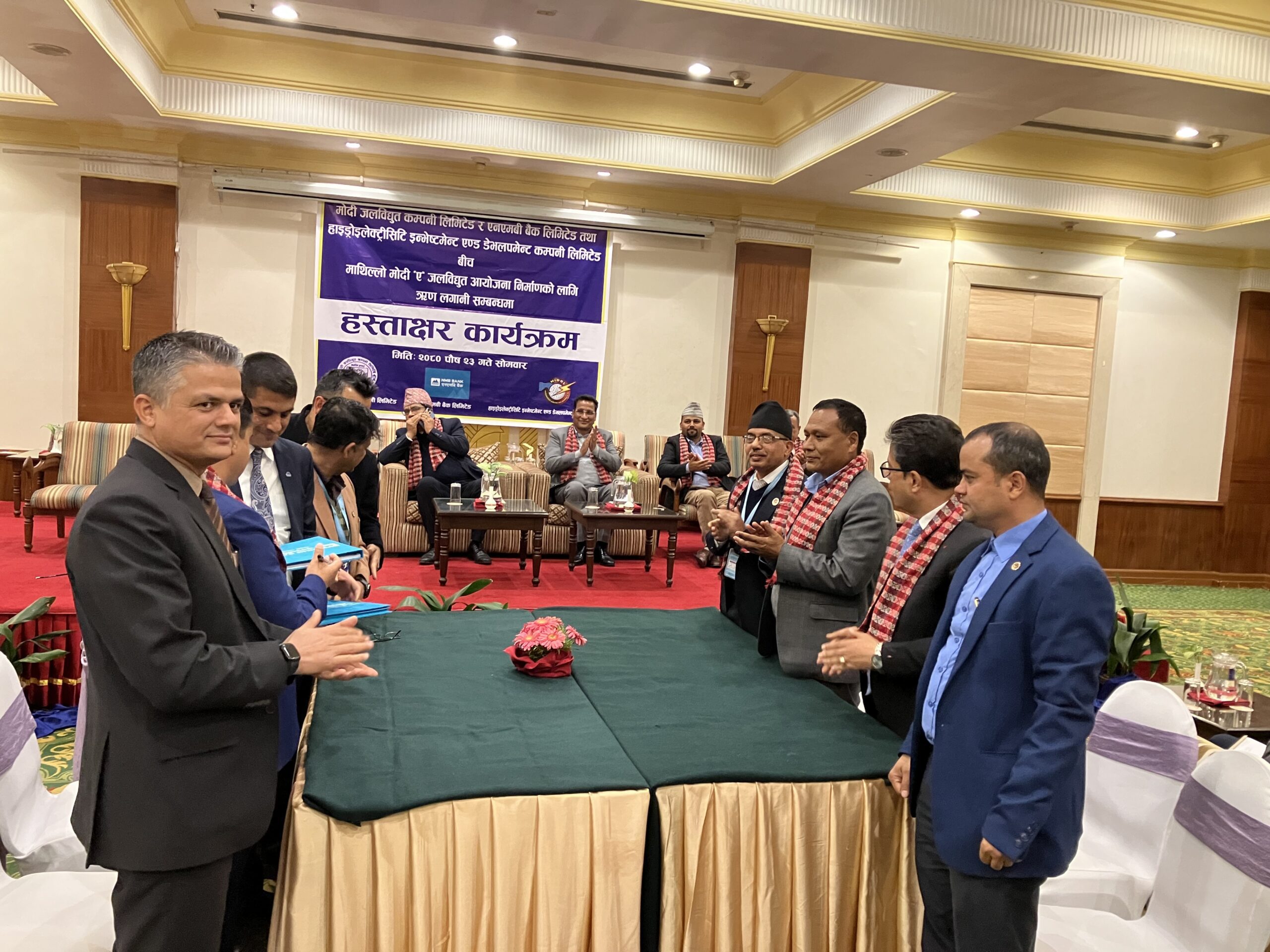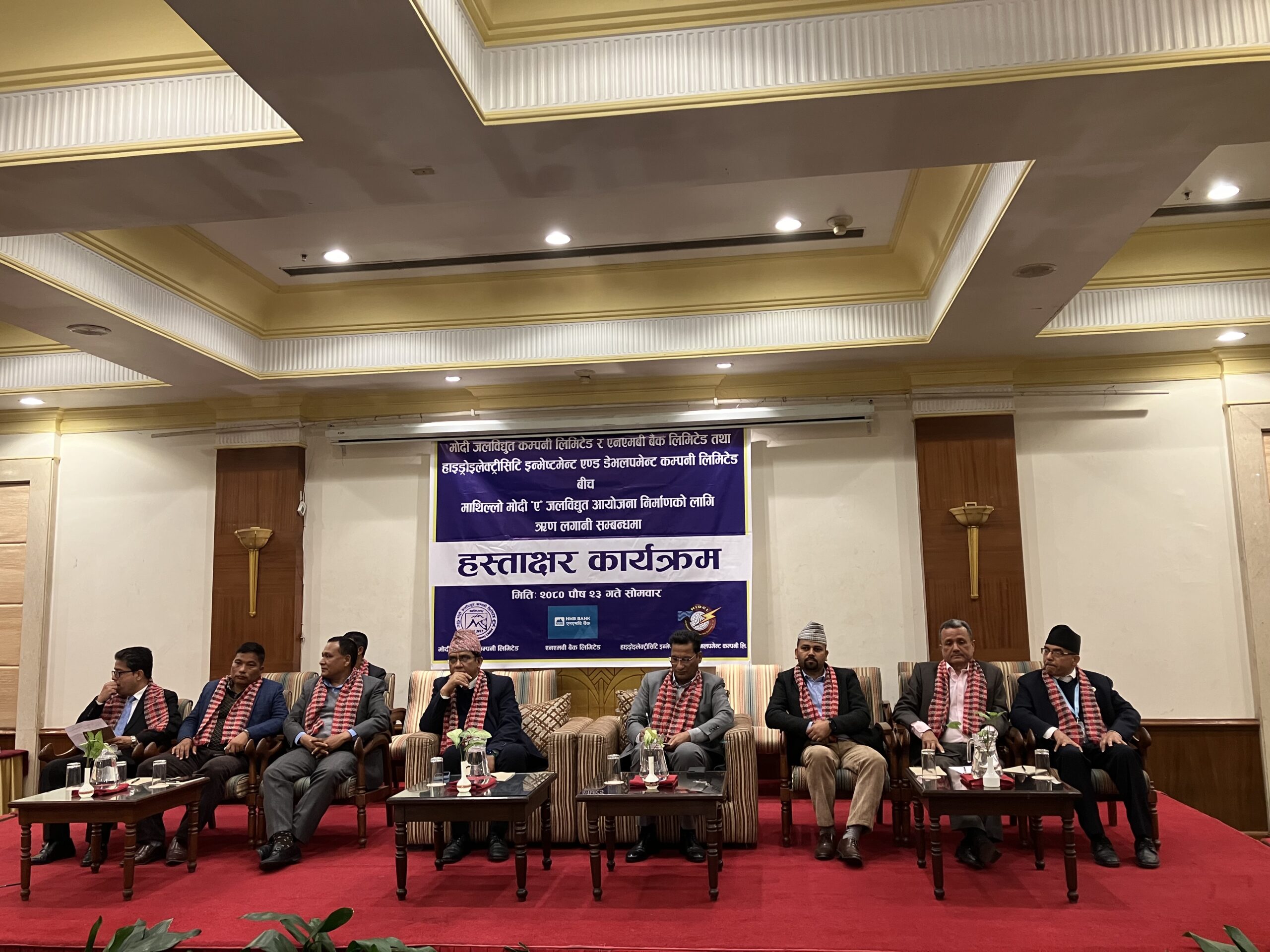 काठमाडौं । नेपाल विद्युत प्राधिकरणको सहायक कम्पनीमार्फत कास्कीको अन्नपूर्ण गाउँपालिकामा निर्माण गर्न लागिएको ४२ मेगावाटको माथिल्लो मोदी ए जलविद्युत आयोजनाको वित्तीय व्यवस्थापन भएको छ ।निर्माण अवधिको ब्याजसहित १० अर्ब ५७ करोड रुपैयाँ अनुमानित लागत रहेको आयोजनामा ७० प्रतिशत ऋणबाट र ३० प्रतिशत स्वपूँजी (इक्विटी)बाट जुटाइएको छ । इक्विटीमा प्राधिकरण र सर्वसाधारणको लगानी रहनेछ ।एनएमबी बैंक र हाइड्रोइलेक्ट्रिसिटी इन्भेष्टमेन्ट एण्ड डेभलेप्मेन्ट कम्पनीले (एचआइडिसिएल) सहवित्तीयकरणमार्फत आयोजनामा निर्माण अवधिको ब्याजसहित ७ अर्ब ४० करोड रुपैयाँ ऋण लगानी गर्ने छन् । कुल ऋणमध्ये एनएमबी बैंकको ४ अर्ब ४० करोड र एचआइडिसिएलको ३ अर्ब रुपैयाँ रहनेछ ।ऊर्जा, जलस्रोत तथा सिंचाइमन्त्री शक्ति बहादुर बस्नेतको उपस्थितिमा सोमबार आयोजनाको प्रवद्र्धक मोदी जलविद्युत कम्पनी लि.,एनएएमबी बैैंक र एचआइडिसिएलबीच त्रिपक्षीय ऋण सम्झौतामा हस्ताक्षर भएको छ ।कार्यक्रममा मन्त्री शक्तिबहादुर बस्नेतले देशभित्र उत्पादित विद्युत् आन्तरिक रुपमै खपत अभिबृद्धि गर्ने र बचत भएको विद्युत्लाई भारत तथा बंगलादेशसम्म बिक्री गर्ने स्पष्ट मार्गनिर्देशसहित सरकारले काम गरिरहेको बताए ।