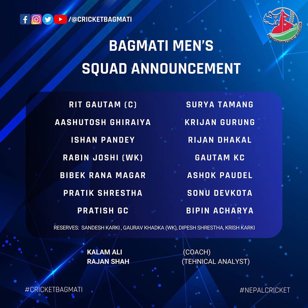 त्यस्तै बागमतीले सन्देश कार्की, गौरव खड्का (विकेट किपर), दिपेश श्रेष्ठ र कृष कार्कीलाई रिजर्भमा राखेको छ । बागमतीको प्रशिक्षकमा कलाम अली र टेक्निकल एनालिस्टमा राजन शाह रहेका छन् । यस बर्षको पीएम कप पुस २८ देखि माघ २० गतेसम्म प्रतियोगिता संचालन हुँदै छ । यस प्रतियोगितामा सात प्रदेशका टिम र तीन विभागीय टिम नेपाल पुलिस क्लब, एपीएफ र नेपाल आर्मीले भाग लिँदै छन् ।