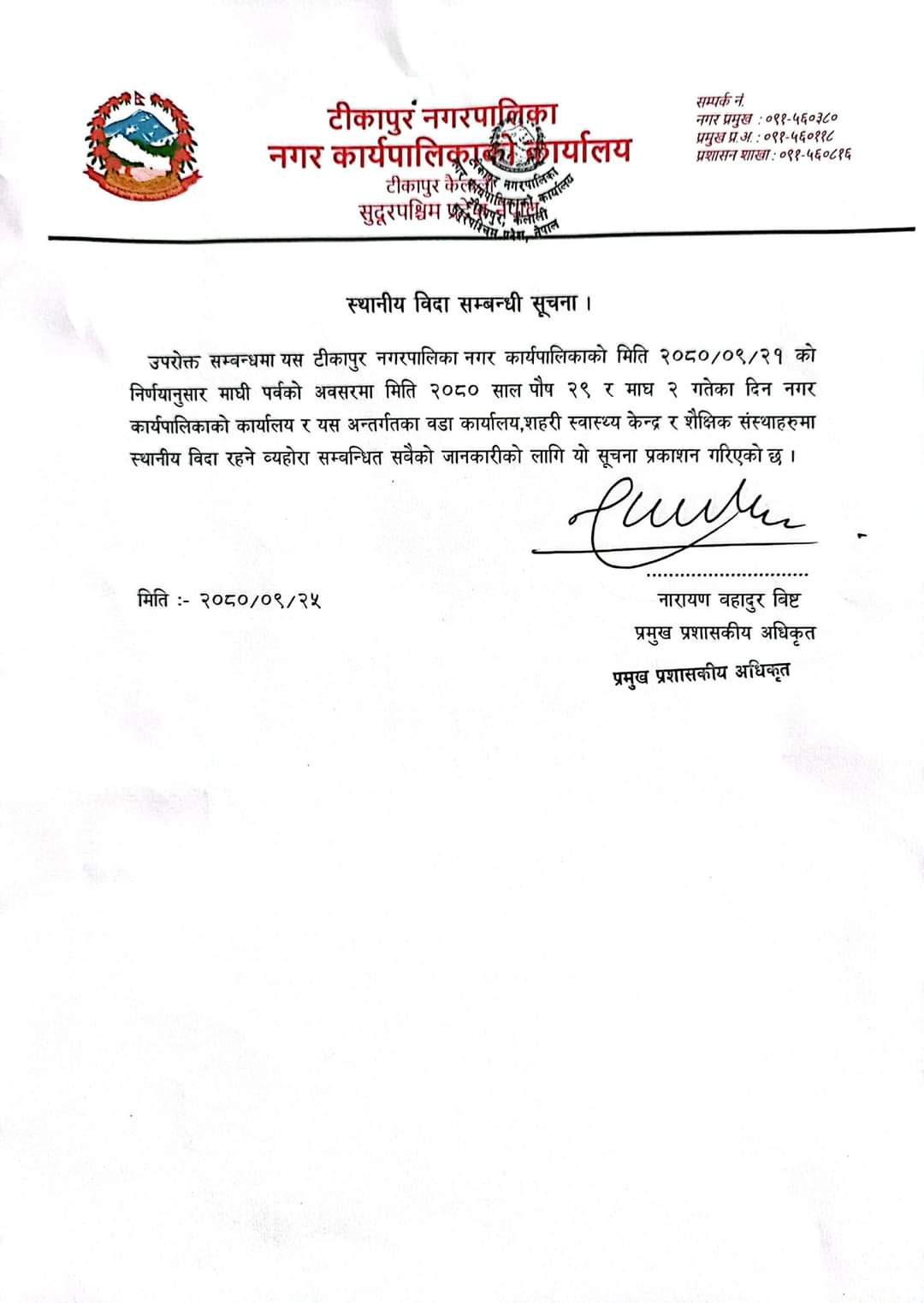 नगरपालिकाले एक सूचना निकालेर बिदाबारे जानकारी गराएको छ । थारु समुदायको माघी पुस महिनाको अन्तिम दिनदेखि सुरु हुने भएकोले पुस २९, माघ १ र २ गते बिदा दिने निर्णय भएको बताइएको छ ।