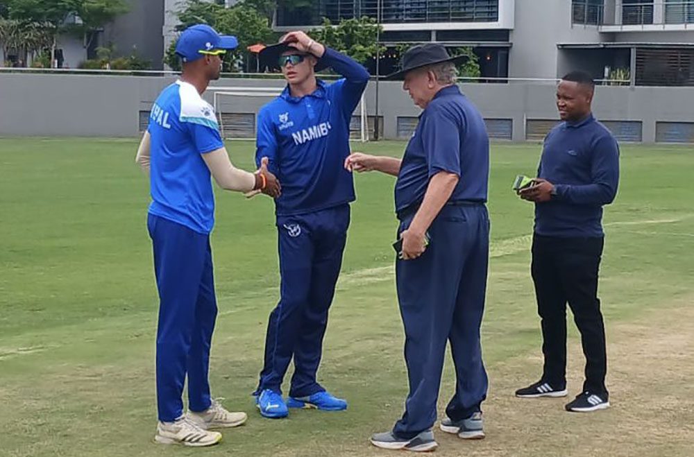 काठमाडौँ। आइसिसी यू- १९ विश्वकप खेल्न दक्षिण अफ्रिकामा रहेको नेपाली टिमले अनौपचारिक वार्मअप खेलमा नामिबियालाई ६ रनले पराजित गरेको छ । बर्षाले प्रभावित हुदा ३०-३० ओभर खेलाइएको यो खेलमा नेपालले दिएको १४२ रनको लक्ष्य पछाएको नामिबिया २९.५ ओभरमा अल आउट हुदै १३५ रन बनाएको थियो ।