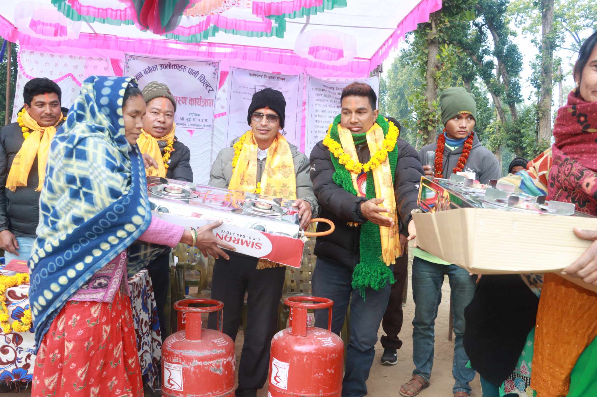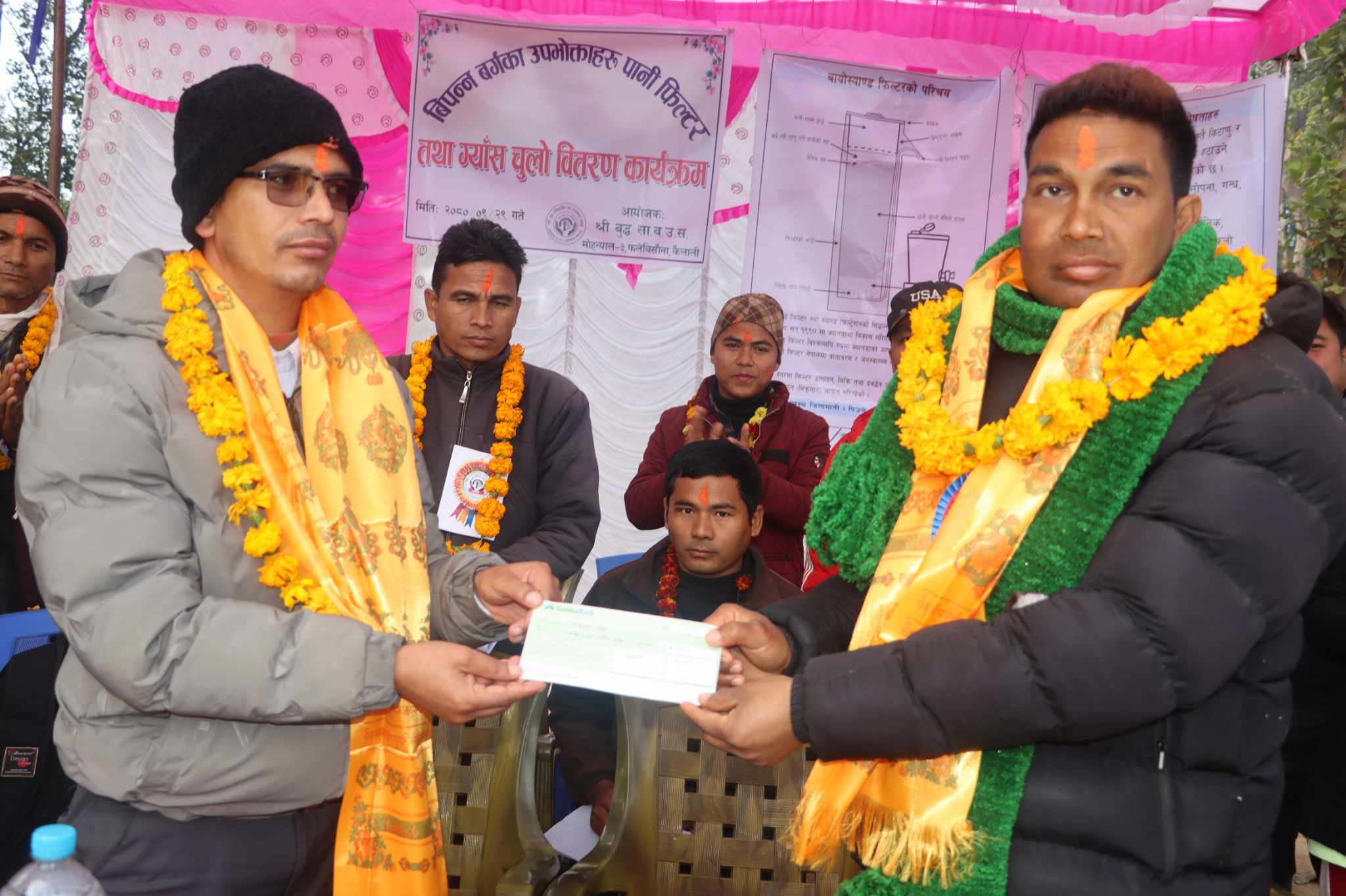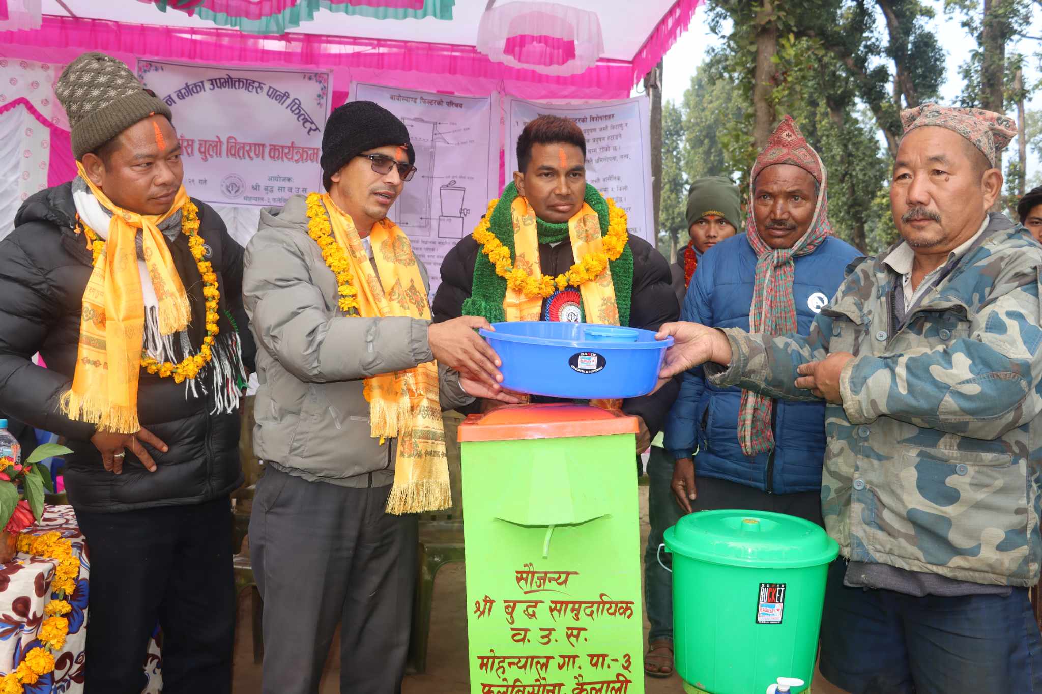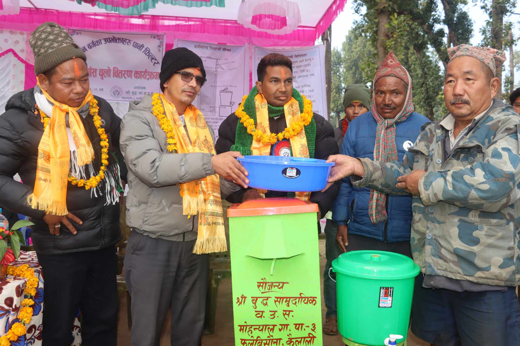 कैलाली । कैलाली जिल्लाको मोहन्याल गाउँपालिका वडा नं ३ फलेविसौनाका विपन्न वर्गका परिवारलाई पानी छान्ने फिल्टर र ग्याँस चुलो सिलिण्डर वितरण गरिएको छ । बुद्ध सामुदायीक वन उपभोक्ता समूहको आर्थिक सहयोगमा गाउँपालिका अध्यक्ष देविदत्त उपाध्याय (हिमशिखर) काे प्रमूख आथित्यमा वितरण गरिएको हो । सामुदायीक वन उपभोक्ता समूहकी सचिव भीम कला थापा मगरले स्वागत मन्तव्य गरेको कार्यक्रममा ५० घरपरिवार परिवारलाई पानी फिल्टर वितरण गरीएको छ भने ५० घर परिवारलाई ग्यास चुलो सिलिण्डर वितरण गरिएको कार्यक्रमका सभापति बुद्ध सामुदायीक वन उपभोक्ता समूहका अध्यक्ष जंग बहादुर बगालेले बताए ।