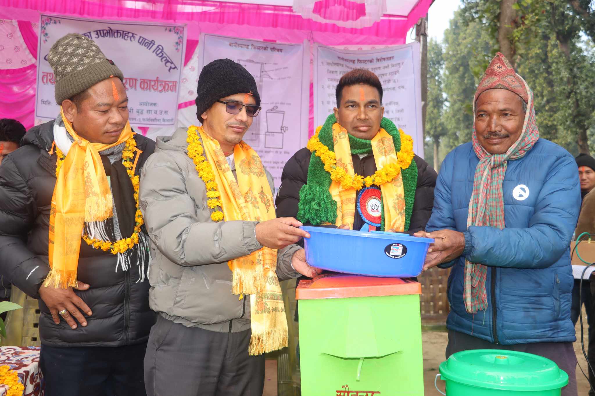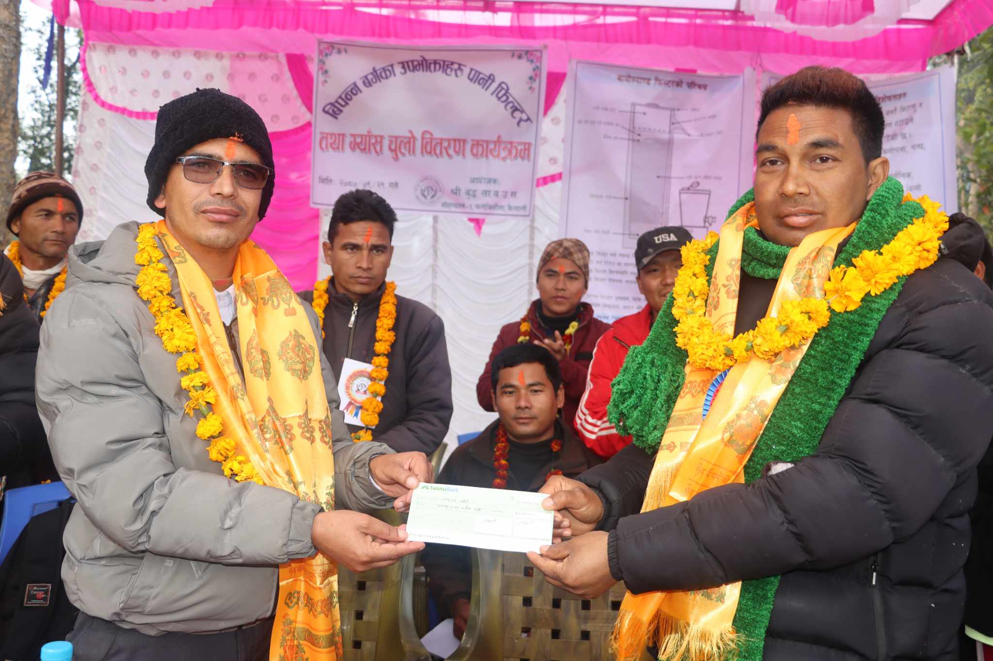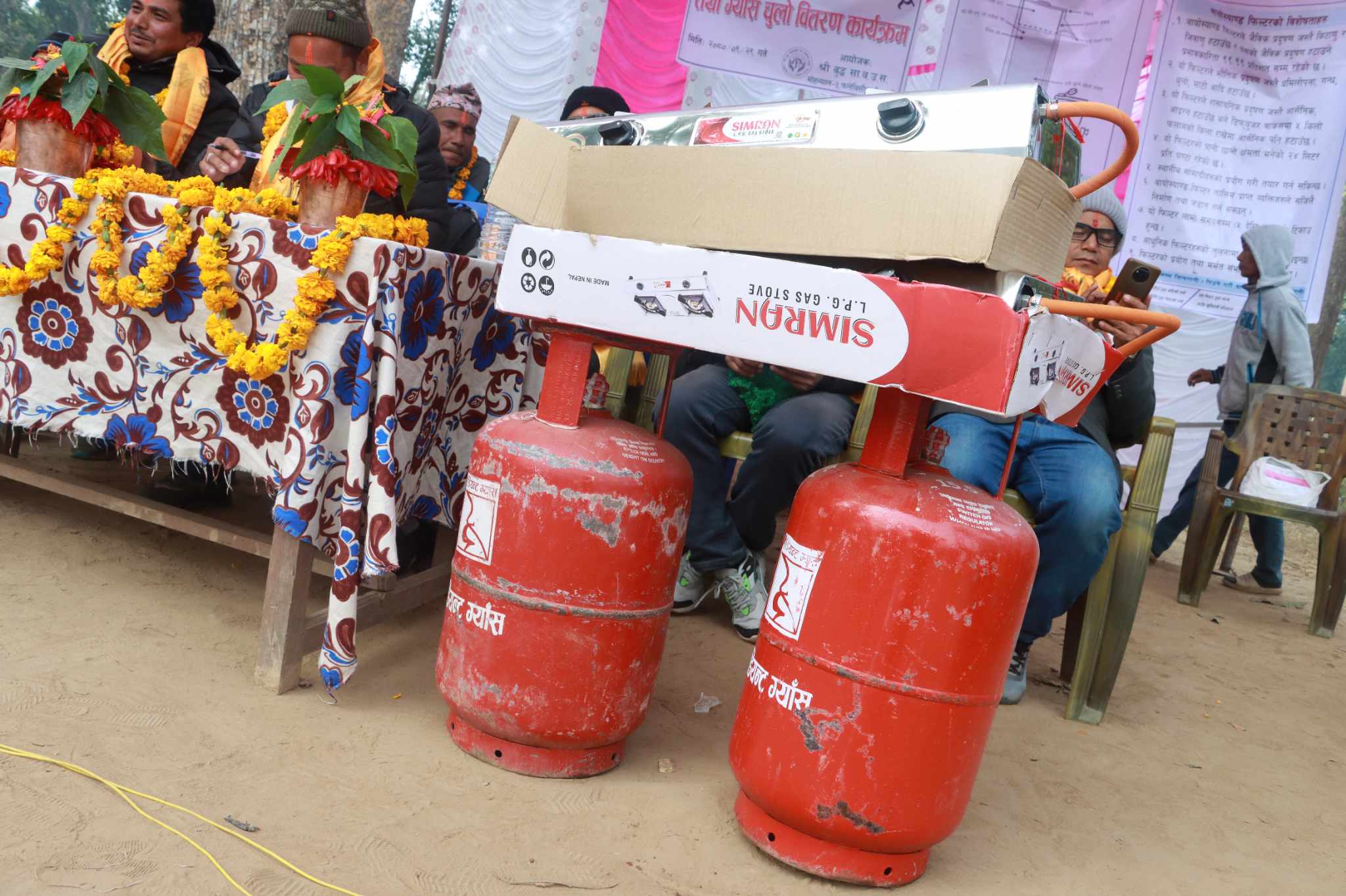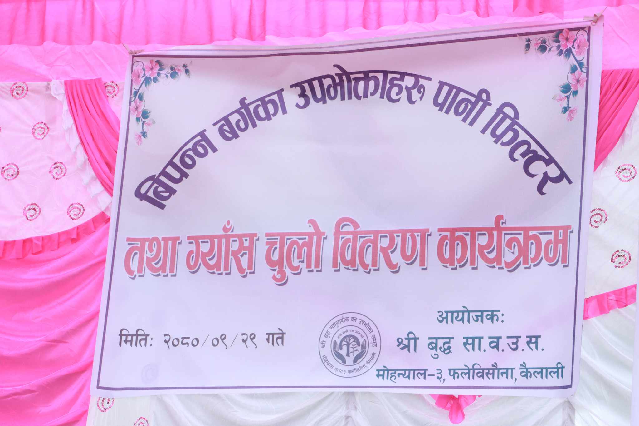 कैलाली । कैलाली जिल्लाको मोहन्याल गाउँपालिका वडा नं ३ फलेविसौनाका विपन्न वर्गका परिवारलाई पानी छान्ने फिल्टर र ग्याँस चुलो सिलिण्डर वितरण गरिएको छ । बुद्ध सामुदायीक वन उपभोक्ता समूहको आर्थिक सहयोगमा गाउँपालिका अध्यक्ष देविदत्त उपाध्याय (हिमशिखर) काे प्रमूख आथित्यमा वितरण गरिएको हो । सामुदायीक वन उपभोक्ता समूहकी सचिव भीम कला थापा मगरले स्वागत मन्तव्य गरेको कार्यक्रममा ५० घरपरिवार परिवारलाई पानी फिल्टर वितरण गरीएको छ भने ५० घर परिवारलाई ग्यास चुलो सिलिण्डर वितरण गरिएको कार्यक्रमका सभापति बुद्ध सामुदायीक वन उपभोक्ता समूहका अध्यक्ष जंग बहादुर बगालेले बताए ।