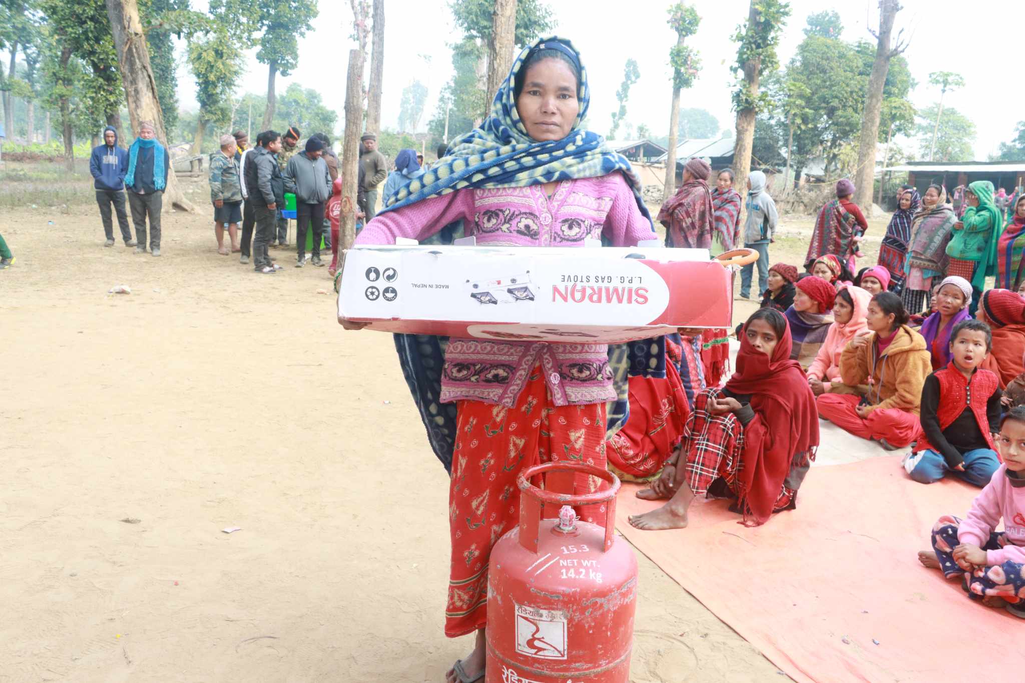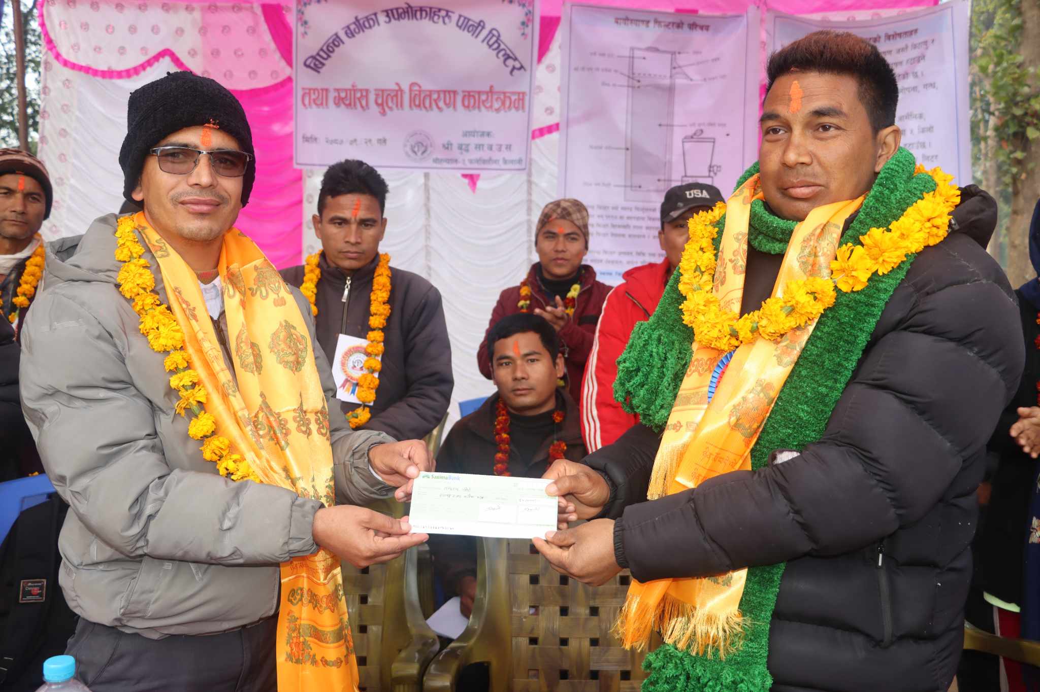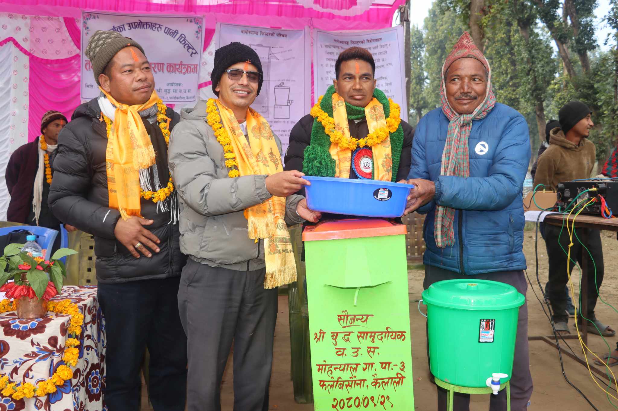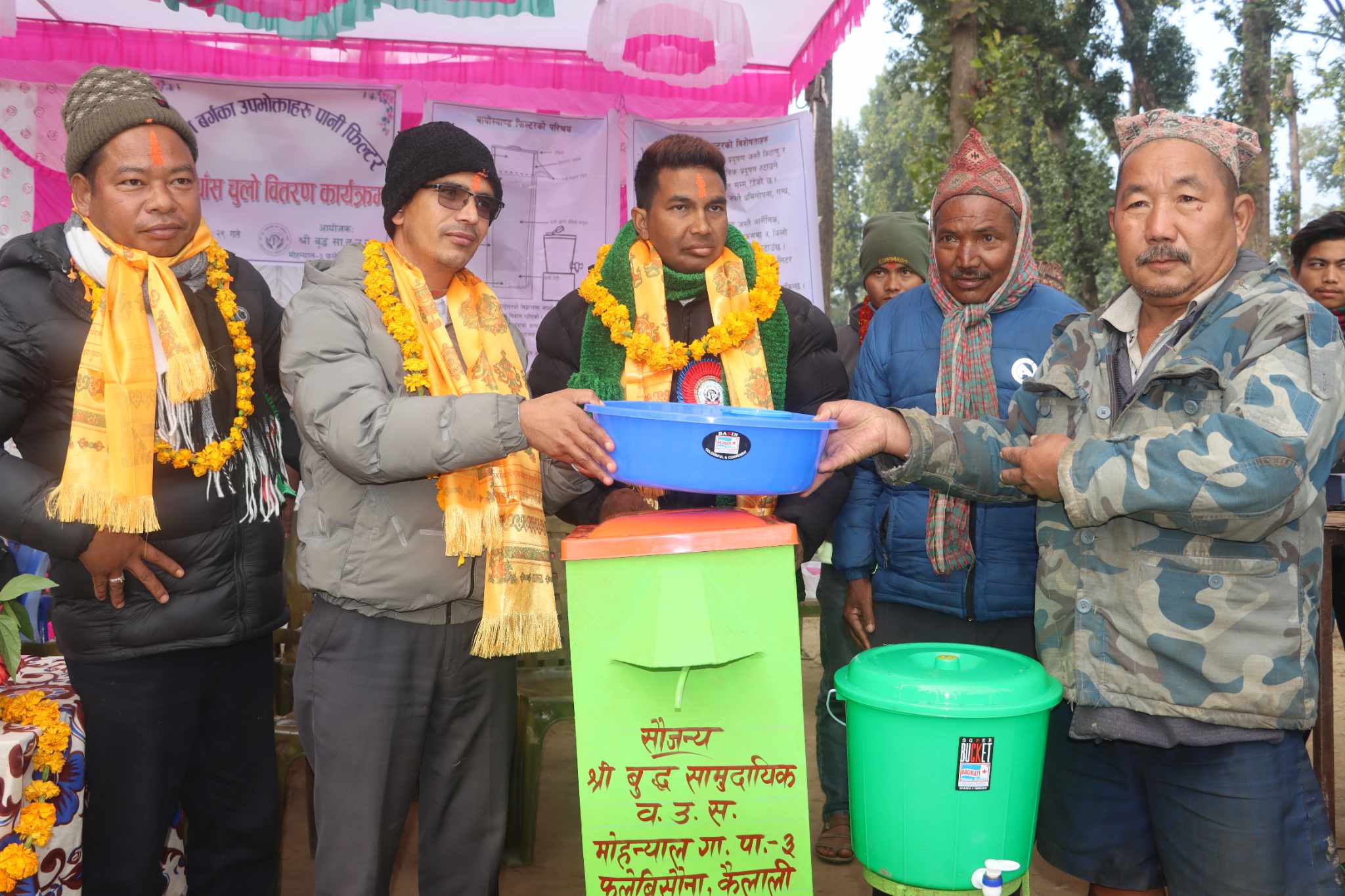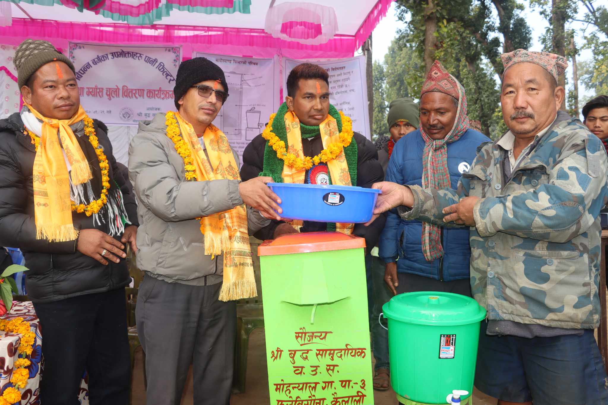 कैलाली । कैलाली जिल्लाको मोहन्याल गाउँपालिका वडा नं ३ फलेविसौनाका विपन्न वर्गका परिवारलाई पानी छान्ने फिल्टर र ग्याँस चुलो सिलिण्डर वितरण गरिएको छ । बुद्ध सामुदायीक वन उपभोक्ता समूहको आर्थिक सहयोगमा गाउँपालिका अध्यक्ष देविदत्त उपाध्याय (हिमशिखर) काे प्रमूख आथित्यमा वितरण गरिएको हो । सामुदायीक वन उपभोक्ता समूहकी सचिव भीम कला थापा मगरले स्वागत मन्तव्य गरेको कार्यक्रममा ५० घरपरिवार परिवारलाई पानी फिल्टर वितरण गरीएको छ भने ५० घर परिवारलाई ग्यास चुलो सिलिण्डर वितरण गरिएको कार्यक्रमका सभापति बुद्ध सामुदायीक वन उपभोक्ता समूहका अध्यक्ष जंग बहादुर बगालेले बताए ।