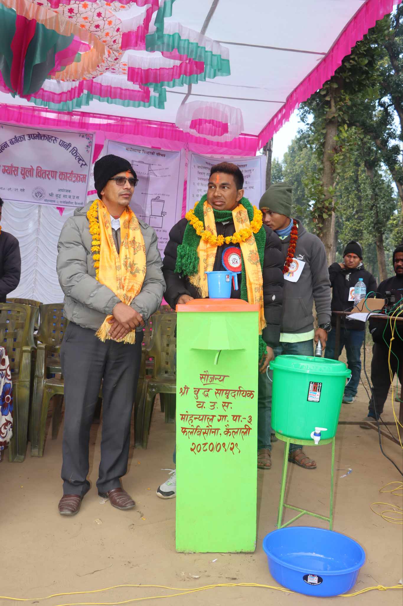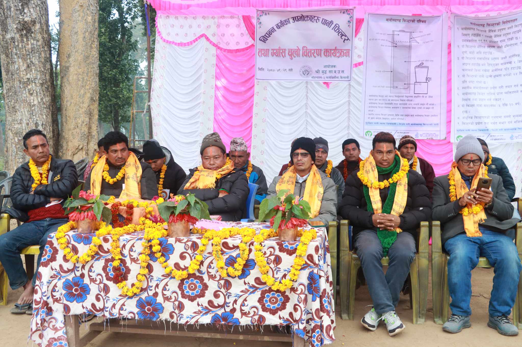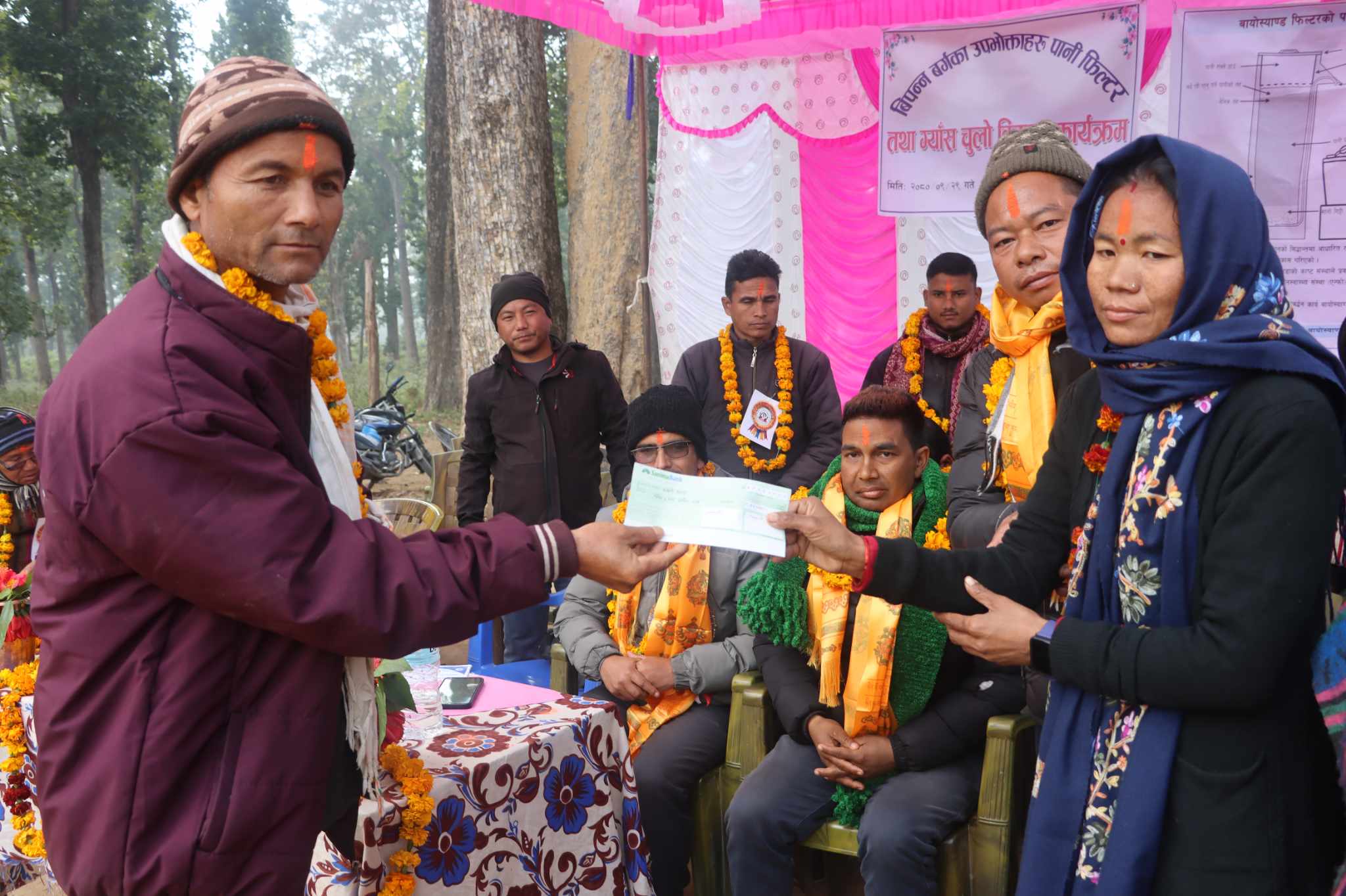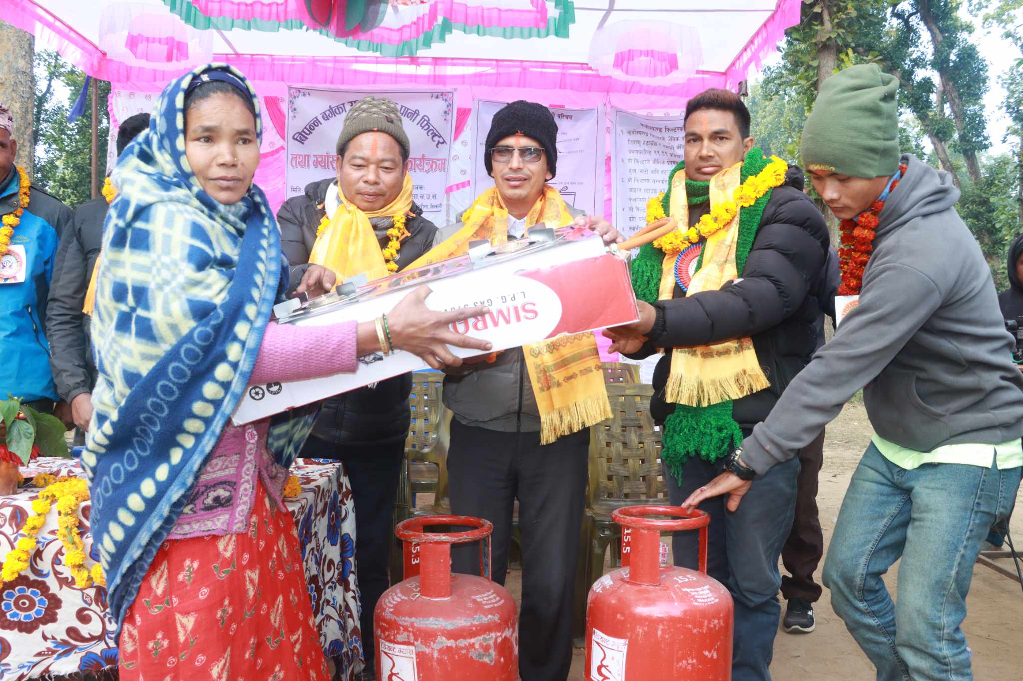 बायोस्याण्ड फिल्टर र ग्याँस चुलो सिलिण्डर वितरण कार्यक्रममा सामुदायीक वनका पदािधकारी , कर्मचारी तथा स्थानीय समाजसेवी बुद्धिजीवीहरु उपस्थितिमा वितरण गरिएकाे हाे । कार्यक्रम संचालक सामुदायीक वन उपभोक्ता समूहका सह- सचिव योगेश बगाले मगरले गरेका थिए। सामुदायीक वनका ९४ घरधुरीलाई निशुल्क फिल्टर र ग्याँस चुला सिलिण्डर वितरण गरेको हो । वन पैदावरको खपत कम गर्नलाई फिल्टर र ग्याँस चुलो सिलिण्डर वितरण गरेको समूहका अध्यक्ष जंग बहादुर बगालेले जानकारी दिनुभयो । झण्डै ६ लाख रुपैयाँको लगानीमा वन पैदावरको खपत कम गर्नलाई शुद्ध खानेपानीको लागि फिल्टर र ग्याँस चुलो सिलिण्डर वितरण गरेको समूहका अध्यक्ष बगालेले जानकारी दिनुभयो । वनबाट उत्पादन भएको ढलापडा काठको दार र दाउरा, संकलित रुपियाँको व्याजबाट प्राप्त रकमलाई वन संरक्षणका लागि प्रयोग गरेको अध्यक्ष बगालेले बताउनुभयो ।