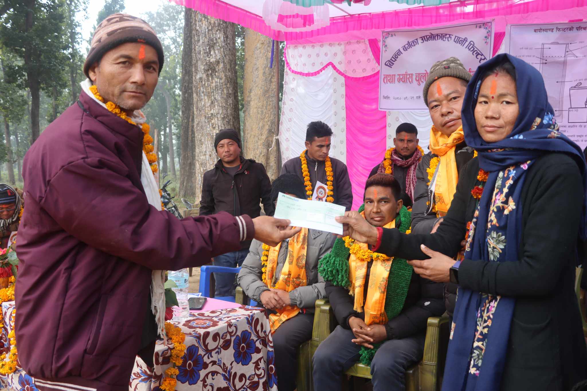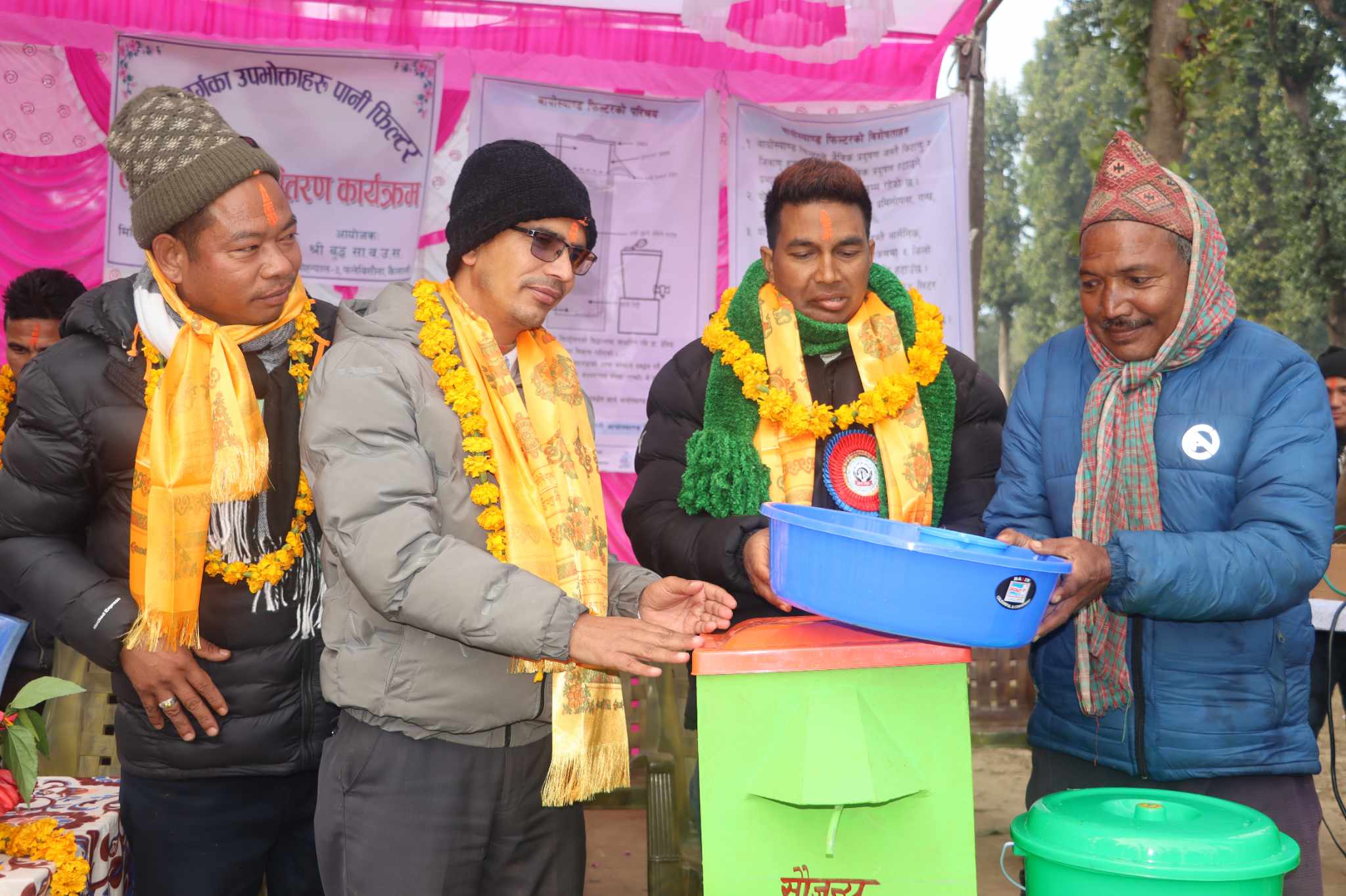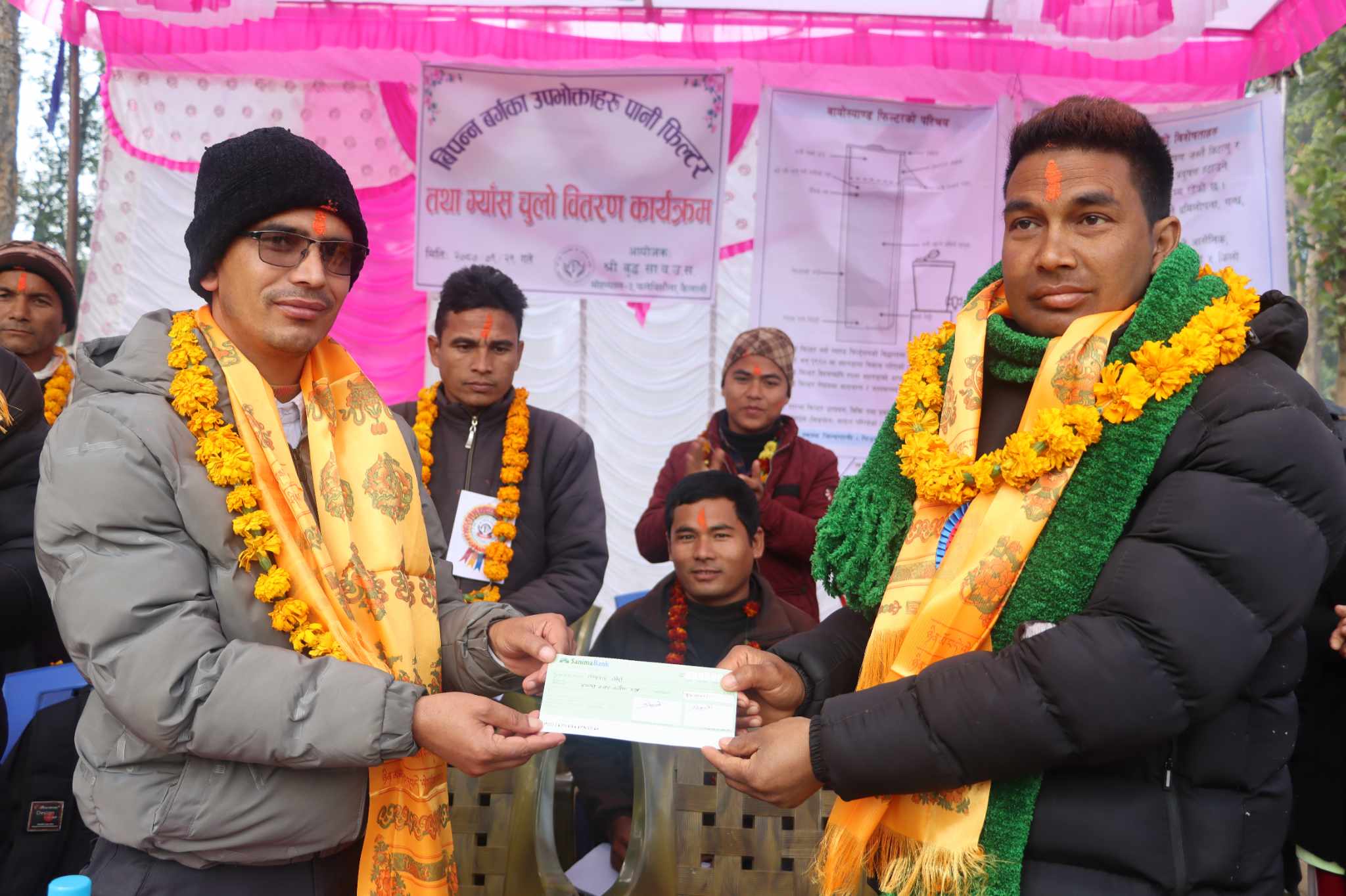 बायोस्याण्ड फिल्टर र ग्याँस चुलो सिलिण्डर वितरण कार्यक्रममा सामुदायीक वनका पदािधकारी , कर्मचारी तथा स्थानीय समाजसेवी बुद्धिजीवीहरु उपस्थितिमा वितरण गरिएकाे हाे । कार्यक्रम संचालक सामुदायीक वन उपभोक्ता समूहका सह- सचिव योगेश बगाले मगरले गरेका थिए। सामुदायीक वनका ९४ घरधुरीलाई निशुल्क फिल्टर र ग्याँस चुला सिलिण्डर वितरण गरेको हो । वन पैदावरको खपत कम गर्नलाई फिल्टर र ग्याँस चुलो सिलिण्डर वितरण गरेको समूहका अध्यक्ष जंग बहादुर बगालेले जानकारी दिनुभयो । झण्डै ६ लाख रुपैयाँको लगानीमा वन पैदावरको खपत कम गर्नलाई शुद्ध खानेपानीको लागि फिल्टर र ग्याँस चुलो सिलिण्डर वितरण गरेको समूहका अध्यक्ष बगालेले जानकारी दिनुभयो । वनबाट उत्पादन भएको ढलापडा काठको दार र दाउरा, संकलित रुपियाँको व्याजबाट प्राप्त रकमलाई वन संरक्षणका लागि प्रयोग गरेको अध्यक्ष बगालेले बताउनुभयो ।