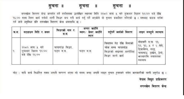 ललितपुर। ललितपुर केही भागमा आज बिधुत सेवा अवरुद्ध हुने भएको छ ।नेपाल विद्युत् प्राधिकरणका अनुसार शुक्रबार बिहान १० देखि दिउँसो ४ बजेसम्म ललितपुरका चापाागाउँ, पाटनलगायतका क्षेत्रमा सेवा अवरुद्ध हुन लागेको हो ।प्राधिकरण अनुसार चापागाऊ फिडर पाटनवाट हुने सेवा प्रवाह अनुसार चिवहाल गेटदेखि सिमाको चोकसम्म चापागांऊ फिडरको लाइनमा कम्पोजिट फिडर तान्ने कार्य गर्नुपर्ने भएकाले विद्युत् सेवा बन्द गरिन लागिएको हो ।जसअनुसार गोदावरी नगरपालिकाको वडा नम्बर ११, १२ १३, ५ र ६ लेले, टिकाभैरव, नल्लु चापागाउ, टाखेल, ठेचो, झरुवारासि लगायतका स्थानहरुमा