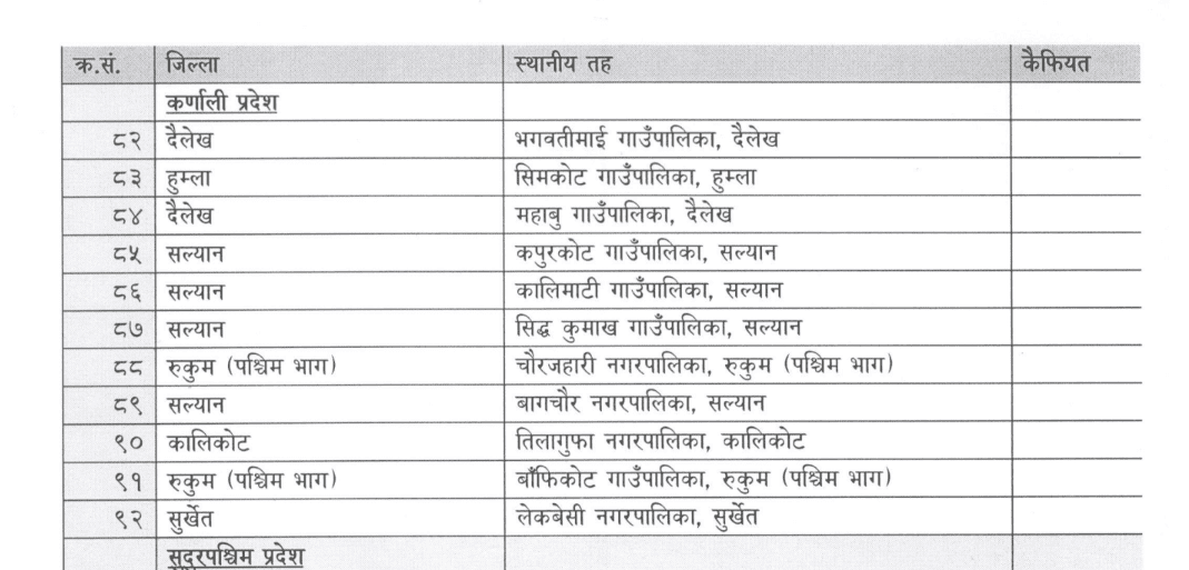 छनौट भएका स्थानीय तहको सूची अनुसार सबैभन्दा बढी कोशी प्रदेशका २० र सबै भन्दा कम कर्णालीमा रहेको छ । कर्णाली प्रदेशका १० वटा स्थानीय तह छनौट भएका छन् । कर्णालीका दैलेखका भगवतीमाइ , महावु , सल्यानको कपुरकोट , बागचौर र कालीमटी , सिद्धकुमाख, हुम्लाको सिमकोट , रुकुम पश्चिमको चौरजहारी , बाफिकोट, कालिकोटको तिलागुफा , र सुर्खेतको लेकबेशी छनोटमा परेका छन् । मन्त्रालयका अनुसार संघीय मामिला तथा मन्त्रालयले मन्त्रीस्तरीय निर्णय गर्दै छनोट गरेका स्थानीय तहमा एकमुष्ट रूपमा साढे ८८ करोड रुपैयाँ पठाइएको जनाइएको छ ।कार्यविधि अनुसार नवप्रवर्तन भन्नाले स्थानीय आर्थिक विकासको क्षेत्रमा नविनतम सोंच, नवीनतम अवधारण, नवीनतम लगानीको ढाँचा र नवीनतम प्रविधिको माध्यमबाट भिन्न तवरले गरिने उद्यमशीलता, सीप विकास, वस्तु तथा सेवाको उत्पादन तथा वितरण सम्बन्धी कार्य भनिएको छ ।