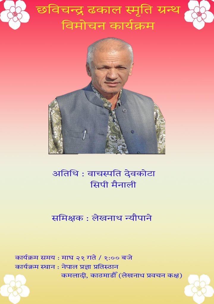 बारा । नेपाली कम्युनिष्ट आन्दोलनको दोस्रो पुस्ताका क्रान्तिकारी एवं समाजसेवामा निरन्तर संल्गन रहेका छविचन्द्र ढकालको सम्झनामा स्मृतिग्रन्थ प्रकाशन भएको छ । स्मृतिग्रन्थको सार्वजनिकीकरण यही माघ २१ गते काठमाण्डौमा नेपाल प्रज्ञाप्रतिष्ठानको लेखनााथ सभाकक्षमा हुँदै छ ।