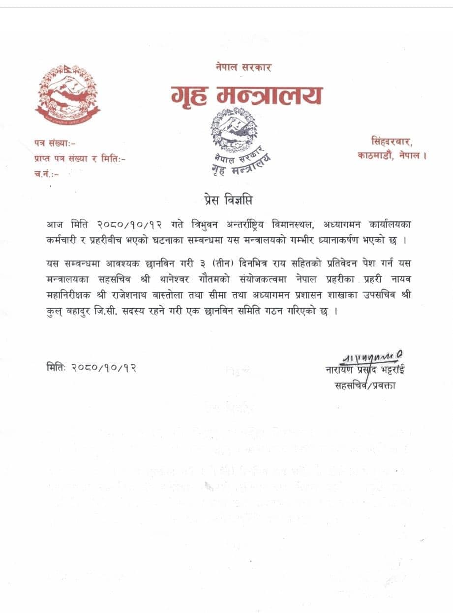 काठमाडौं । त्रिभुवन अन्तराष्ट्रिय विमानस्थल, अध्यागमन कार्यालयमा अध्यागमनका कर्मचारीलाई प्रहरीले कुटेको बारेमा छानबिन गर्न गृह मन्त्रालयले छानबिन समिति गठन गरेको छ।घटनाको आवश्यक छानबिन गरी तीन दिनभित्र प्रतिवेदन पेश गर्न तीन सदस्यीय छानबिन समिति गठन गरिएको मन्त्रालयका प्रवक्ता नारायणप्रसाद भट्टराईले एक वक्तव्य जारी जनाए।मन्त्रालयका सहसचिव थानेश्वर गौतमको संयोजकत्वमा गठित समितिमा नेपाल प्रहरीका प्रहरी नायब महानिरीक्षक राजेशनाथ बास्तोला र सीमा तथा अध्यामन प्रशासन शाखाका उपसचिव कुलबहादुर जिसी सदस्य छन्।