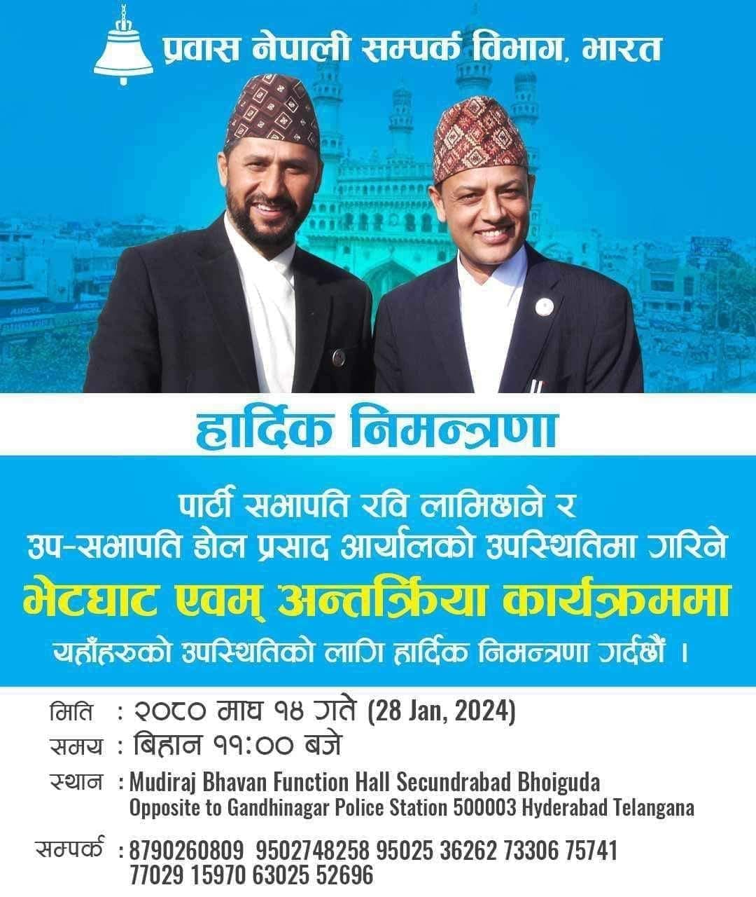 काठमाडौं । राष्ट्रिय स्वतन्त्र पार्टीका सभापति रवि लामिछाने भारत जाँदैछन । सभापति रवि लामिछाने दुई दिनसम्म भारतमा रहनेछन भने उनी १५ गते स्वदेश फर्कने छन् । सो भ्रमणको क्रममा भारतका नेपाली शुभेच्छुकले आयोजना गरेको कार्यक्रममा सभापति लामिछने सहभागी हुनेछन । जसअनुसार रास्वपा सभापति लामिछाने र उपसभापति डीपी अर्याल आज नयाँ दिल्ली प्रस्थान गरेका हुन । उनीहरूले आज नयाँ दिल्ली र भोलि हैदरवादमा आयोजित कार्यक्रममा सहभागी हुने केन्द्रिय सदस्य दिपक बाेहराले जानकारी दिए ।माघ १३ र १४ गते भारतका बिभिन्न कार्यक्रममा रहने भएकाले उपसभापति डा. स्वर्णिम वाग्लेलाई पार्टीको कार्यवाहक सभापतिको जिम्मेवारी तोकिएको छ ।