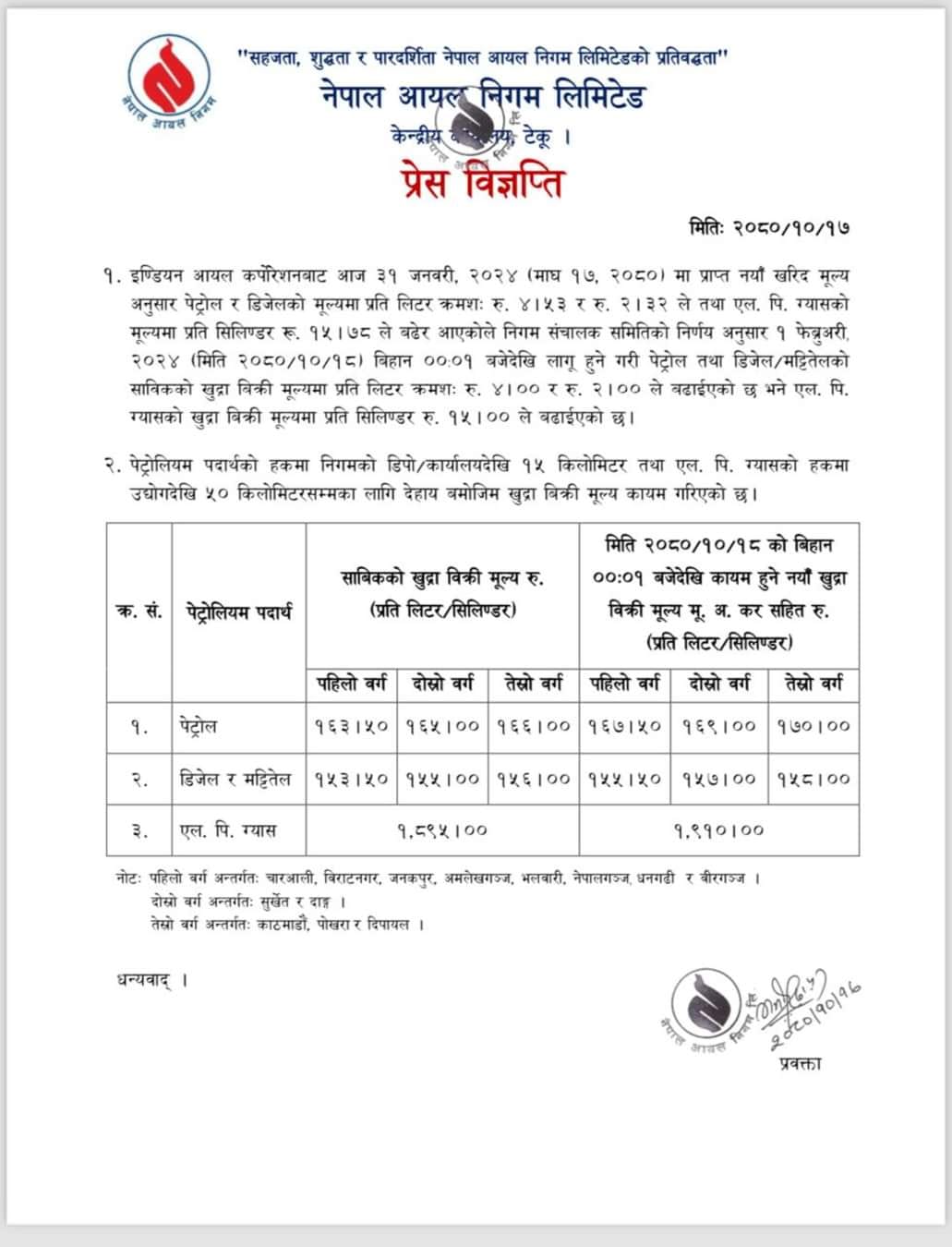 त्यसैगरी, डिजेल र मट्टितेलको भाउ प्रतिलिटर पहिलो वर्गलाई १५५.५० रुपैयाँ, दोस्रोलाई १५७ रुपैयाँ र तेस्रोलाई १५८ रुपैयाँ पर्न जान्छ । खाना पकाउने एलपी ग्यासको मूल्य भने १५ रुपैयाँले बढेको १९१० रुपैयाँ कायम भएको छ ।