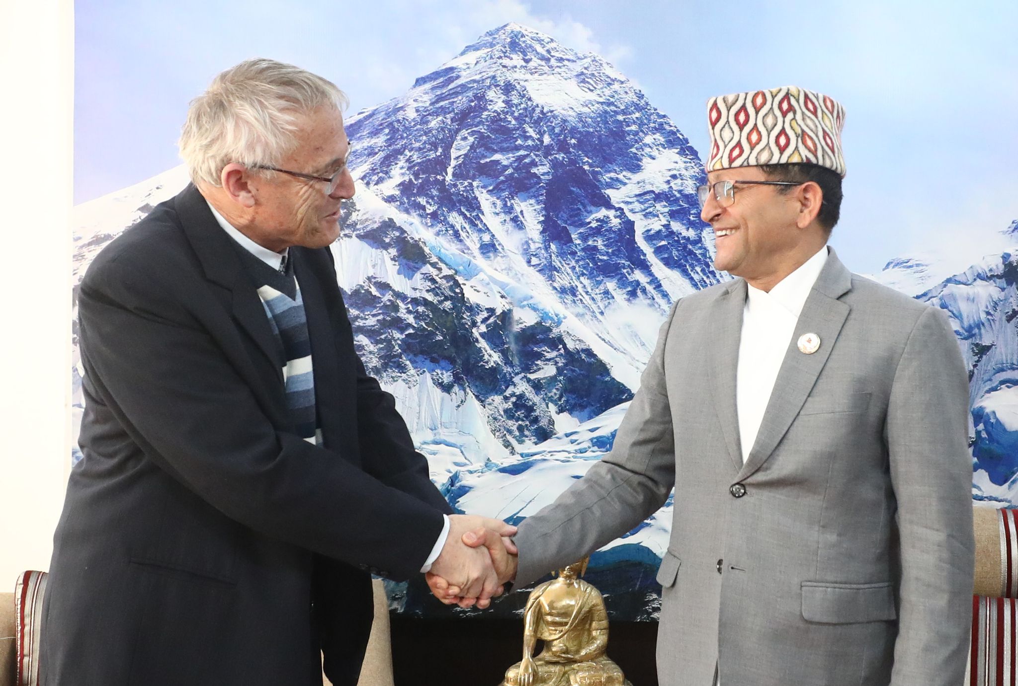 काठमाडौं । राष्ट्रिय सभाका अध्यक्ष गणेशप्रसाद तिमिल्सिनासँग नेपालका लागि इजरायलका राजदूत हनान गोडर गोल्डबर्गरले शिष्टाचार भेट गरेका छन् । बिहीबार सिंहदरबारस्थित अध्यक्षको कार्यकक्षमा राजदूत गोल्डबर्गरले अध्यक्ष तिमिल्सिनासँग शिष्टाचार भेट गरेका हुन् । भेटका अवसरमा अध्यक्ष तिमिल्सिनाले शान्ति र अहिंसाको मूलमन्त्र बोकेको नेपालले विश्वभर शान्ति चाहने बताउँदै मध्यपूर्वमा पनि छिटो शान्ति कायम होस् भन्ने चाहेको बताए । ‘शान्तिको पक्षधर मुलुक नेपाल सँधै मध्यपूर्वमा शान्ति, अमनचयन र स्थिरताको पक्षमा रहिआएको छ,’ उनले भने । हालै इजरालयमा भएको हमासको आक्रमणमा परी अहिलेसम्म बेपत्ता पारिएका नेपाली विद्यार्थी विपीन जोशीको सकुशल रिहाइका लागि अझै सार्थक पहल गर्न आग्रह पनि गरे ।