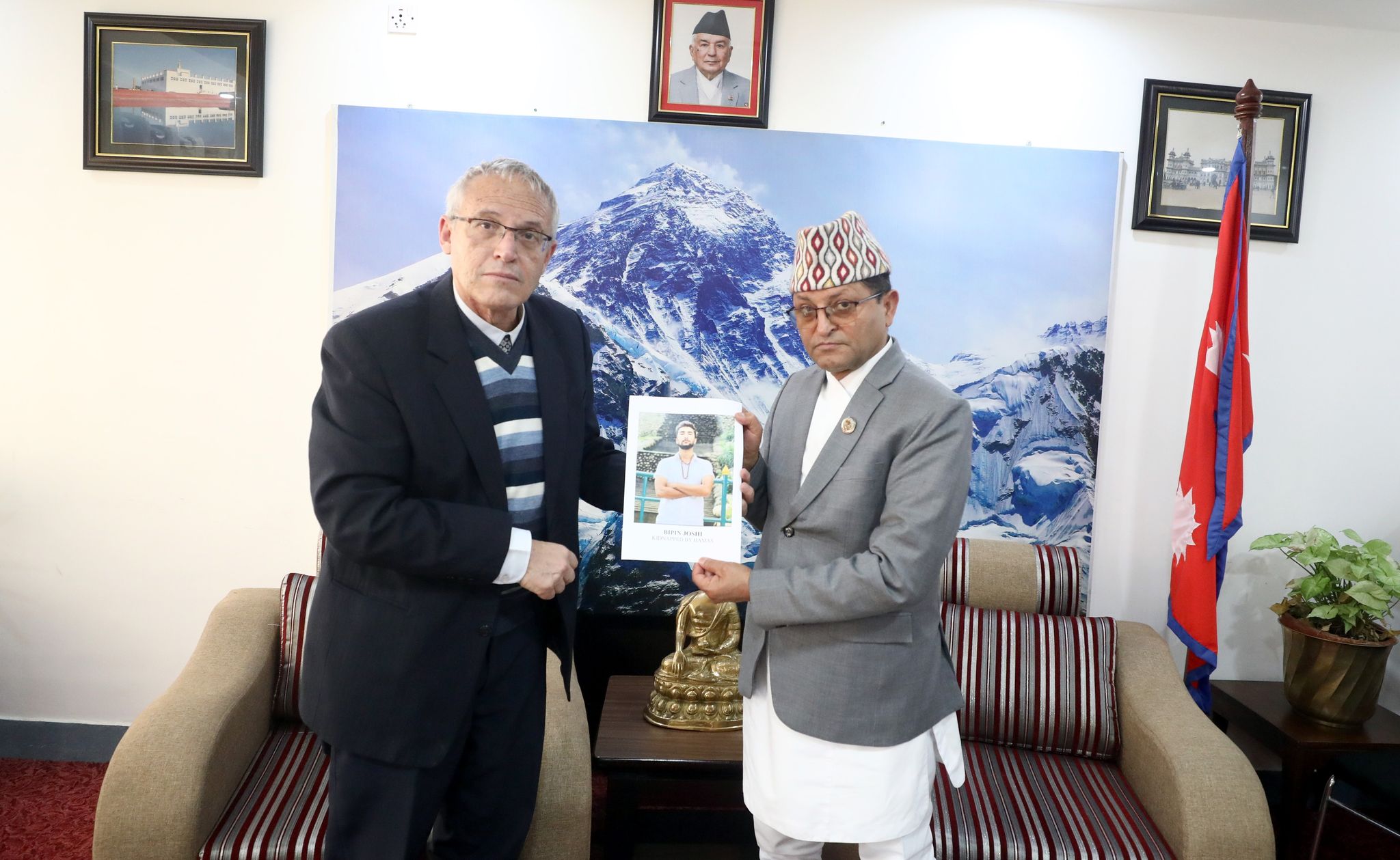 काठमाडौं । राष्ट्रिय सभाका अध्यक्ष गणेशप्रसाद तिमिल्सिनासँग नेपालका लागि इजरायलका राजदूत हनान गोडर गोल्डबर्गरले शिष्टाचार भेट गरेका छन् । बिहीबार सिंहदरबारस्थित अध्यक्षको कार्यकक्षमा राजदूत गोल्डबर्गरले अध्यक्ष तिमिल्सिनासँग शिष्टाचार भेट गरेका हुन् । भेटका अवसरमा अध्यक्ष तिमिल्सिनाले शान्ति र अहिंसाको मूलमन्त्र बोकेको नेपालले विश्वभर शान्ति चाहने बताउँदै मध्यपूर्वमा पनि छिटो शान्ति कायम होस् भन्ने चाहेको बताए । ‘शान्तिको पक्षधर मुलुक नेपाल सँधै मध्यपूर्वमा शान्ति, अमनचयन र स्थिरताको पक्षमा रहिआएको छ,’ उनले भने । हालै इजरालयमा भएको हमासको आक्रमणमा परी अहिलेसम्म बेपत्ता पारिएका नेपाली विद्यार्थी विपीन जोशीको सकुशल रिहाइका लागि अझै सार्थक पहल गर्न आग्रह पनि गरे ।