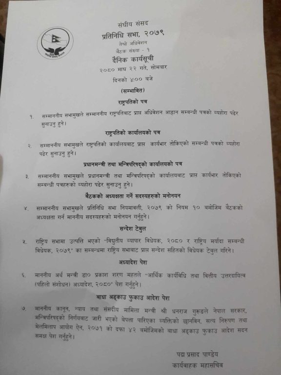 साथै, सभामुखले प्रधानमन्त्री तथा मन्त्रिपरिषद्को कार्यालयबाट प्राप्त कार्यभार तोकिएको सम्बन्धी पत्रहरुको व्यहोरा पढेर सुनाउने कार्यतालिका रहेको छ। त्यसैगरी, सभामुखले प्रतिनिधिसभा नियमावली २०७९ अनुसार बैठकको अध्यक्षता गर्ने सदस्यहरुको मनोनयन गर्ने कार्यसूची तय भएको छ। यसैगरी, राष्ट्रिय सभामा उत्पत्ति भएर सन्देशसहित प्राप्त विद्युतीय व्यापार विधेयक २०८० र राष्ट्रिय मर्यादासम्बन्धी विधेयक २०७९ टेबुल हुने लगायतका कार्यतालिका रहेको छ।