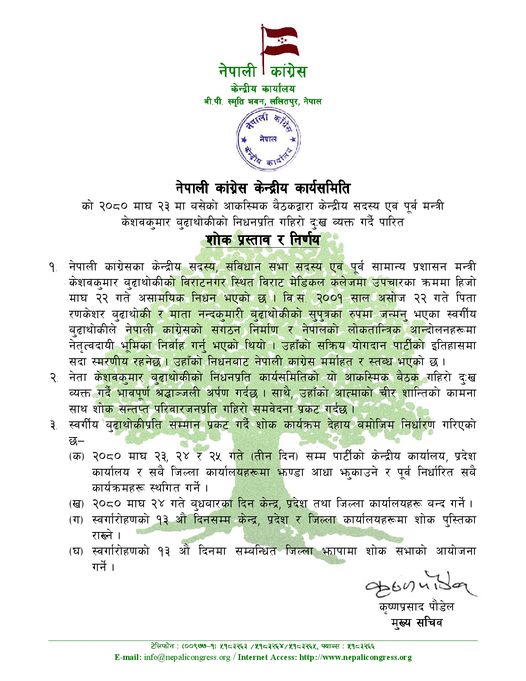 ‘नेता केशवकुमार बुढाथोकीको निधनप्रति कार्यसमितिको यो आकस्मिक बैठक गहिरो दुःख व्यक्त गर्दै भावपूर्ण श्रद्धाञ्जली अर्पण गर्दछ । साथै, उहाँको आत्माको चीर शान्तिको कामना साथ शोक सन्तप्त परिवारजनप्रति गहिरो समवेदना प्रकट गर्दछ,’ जारी बिज्ञप्तिमा भनिएको छ ।