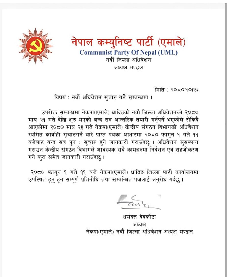 गत १९ माघमा उद्घाटन भएको अधिवेशन आन्तरिक विवादका कारण स्थगित भएको थियो। विवाद बढेपछि पार्टी अध्यक्ष केपी शर्मा ओलीले दुवै पक्षलाई बालकोट बोलाएर छलफल गरेका थिए। छलफलपछि प्रतिनिधि छनोटमाथि केन्द्रीय संगठन विभागले अनुसन्धान गरेर बन्द सत्र सुरु गर्ने सहमति जुटेको थियो।एमाले धादिङको अध्यक्षमा भूमि त्रिपाठी र रामकुमार अधिकारी आकांक्षी छन्।
