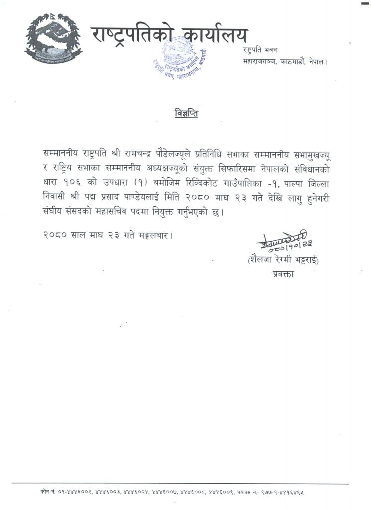 राष्ट्रपति कार्यालयले जारी गरेको विज्ञप्तिमा भनिएको छ, ‘सम्माननीय राष्ट्रपति श्री रामचन्द्र पौडेलज्यूले प्रतिनिधि सभाका सम्माननीय सभामुखज्यू र राष्ट्रिय सभाका सम्माननीय अध्यक्षज्यूको संयुक्त सिफारिसमा नेपालको संविधानको धारा १०६ को उपधारा १० बमोजिम रिव्दिकोट गाउँपालिका – १, पाल्पा जिल्ला निवासी श्री पद्म प्रसाद पाण्डेयलाई मिति २०८० माघ २३ गते देखि लागु हुनेगरी संघीय संसदको महासचिव पदमा नियुक्त गर्नुभएको छ।’राष्ट्रपति कार्यालयकी प्रवक्ता शैलजा रेग्मी भट्टराईले संविधानको धारा १०६ को उपधारा (१) बमोजिम राष्ट्रपतिले पाण्डेयलाई संघीय संसदको महासचिव पदमा नियुक्त गरेको जानकारी दिइन् ।