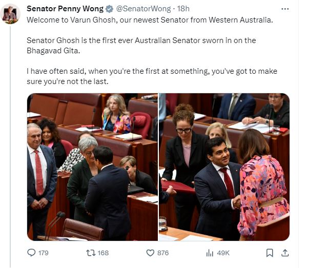 पर्थ । अस्ट्रेलियाको संसदमा भारतीय मूलका ब्यारिस्टर वरुण घोषले नयाँ सिनेटर बनेका छन् । नयाँ सिनेटरमा चयन भएका घोषले भागवद् गीतामा हात राखेर पद तथा गोपनियताका शपथ लिएका छन् । गीतामा हात राखेर अष्ट्रेलियामा पद तथा गोपनियताको सपथ लिने घोष यसो गर्ने पहिलो व्यक्तिसमेत हुन्।